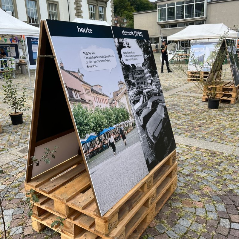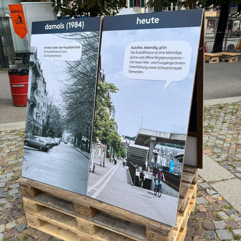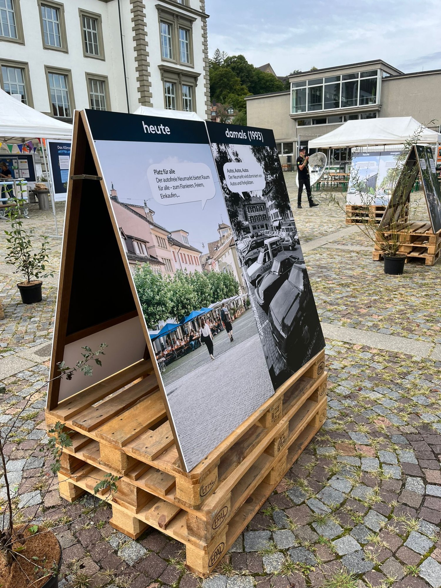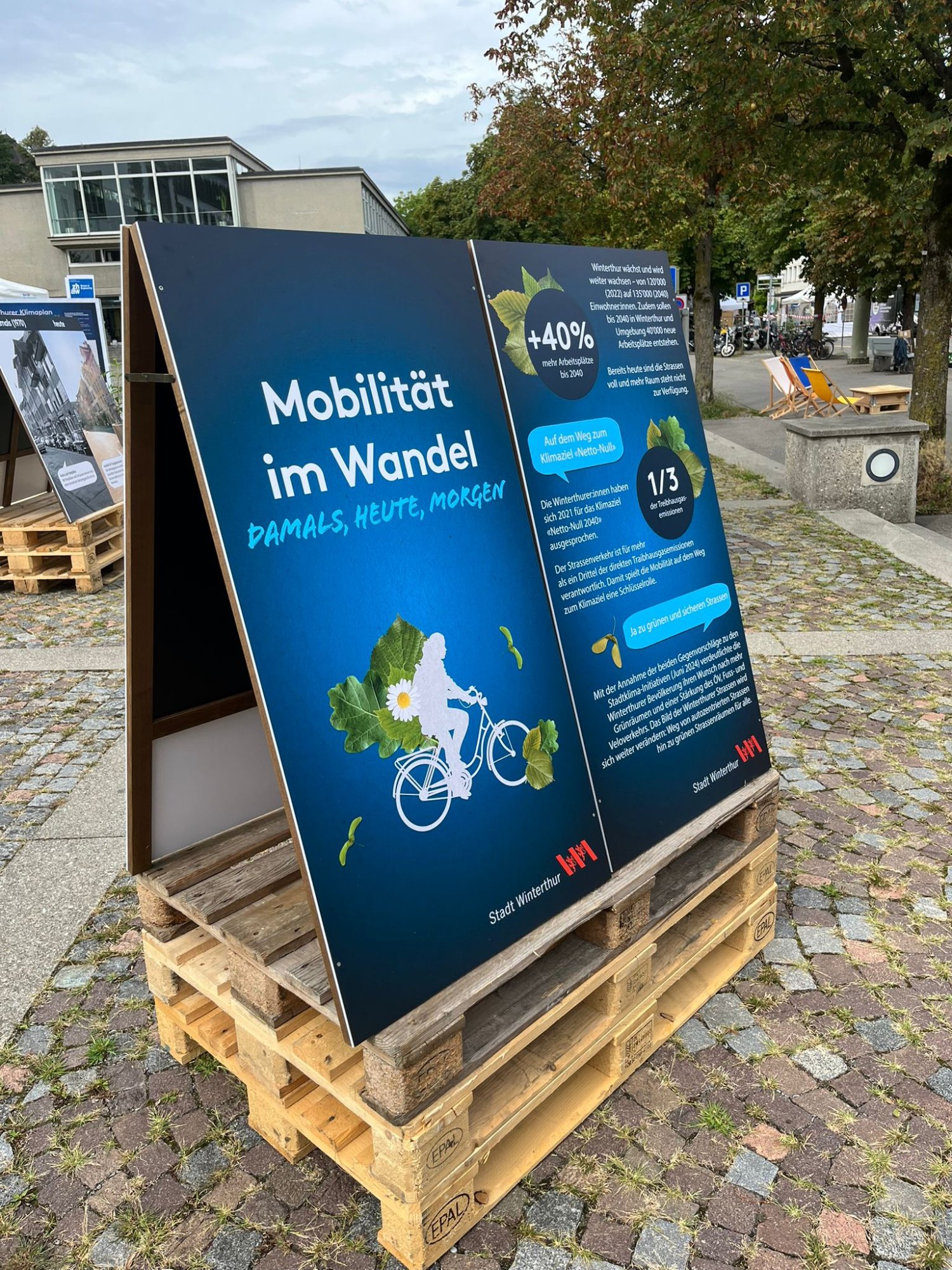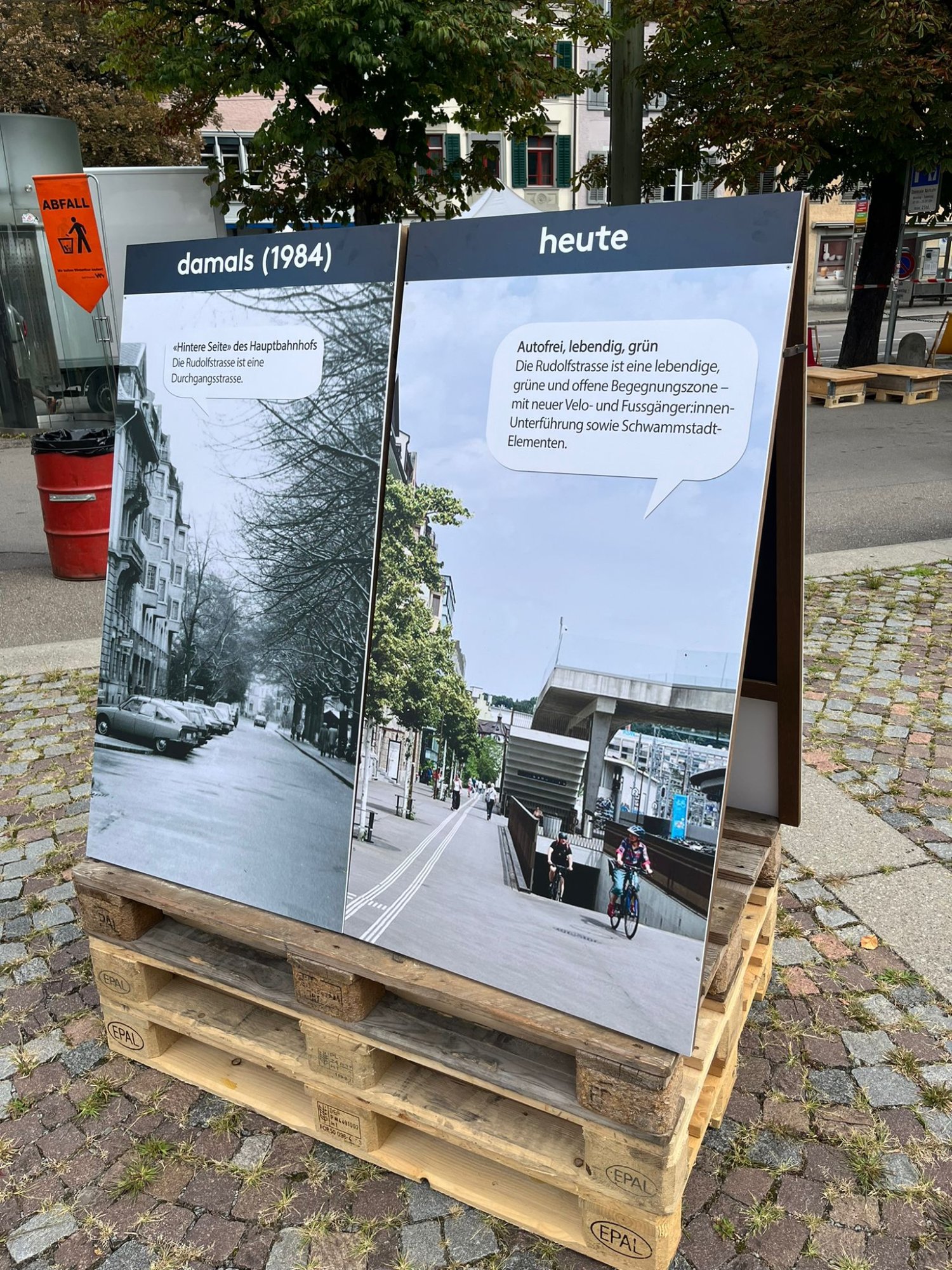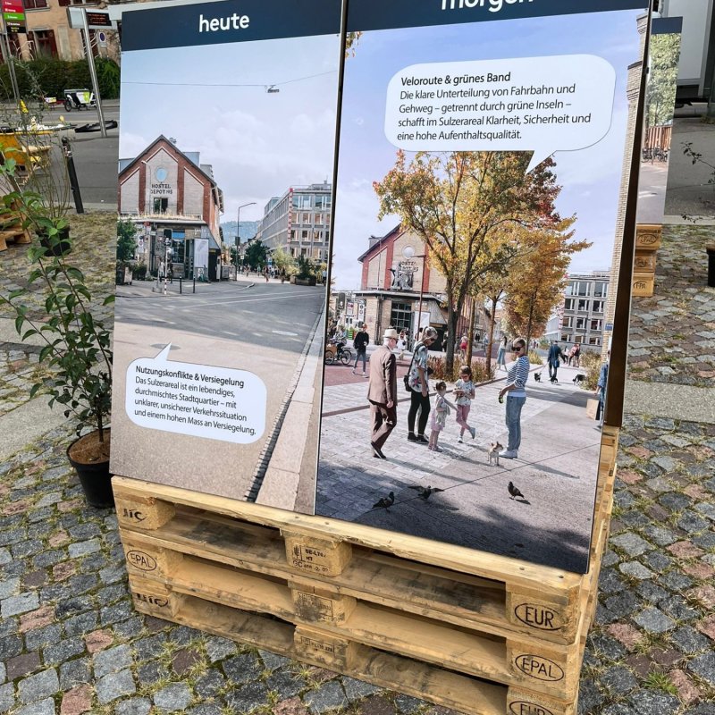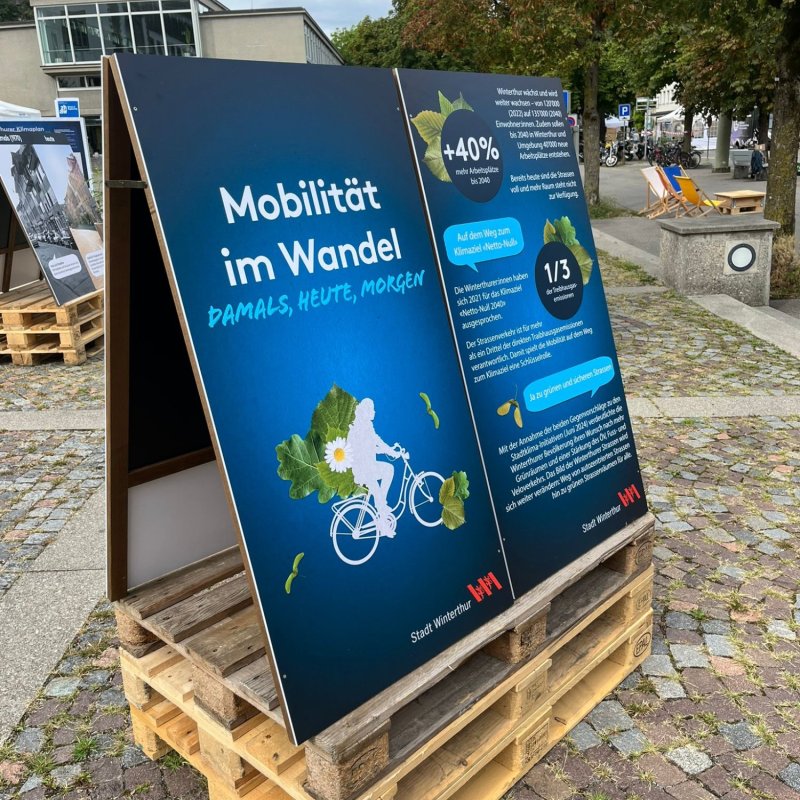 Im Aussenbereich um den Cube fand eine Aussenaustellung der Stadt Winterthur zum Thema "Mobilität im Wandel" statt. Ziel war es, verschiedene Strassensituation in einem Vorher-Nachher-Vergleich zu zeigen. Unsere Aufgabe war es, Vorschläge einzubringen, wie diese Aussenausstellung den Kriterien der Stadt entsprechen kann. Mit den Paletten und Kundenstoppern fanden wir eine nachhaltige, platzsparende, wetterfeste Lösung, die immer wieder eingesetzt werden kann.