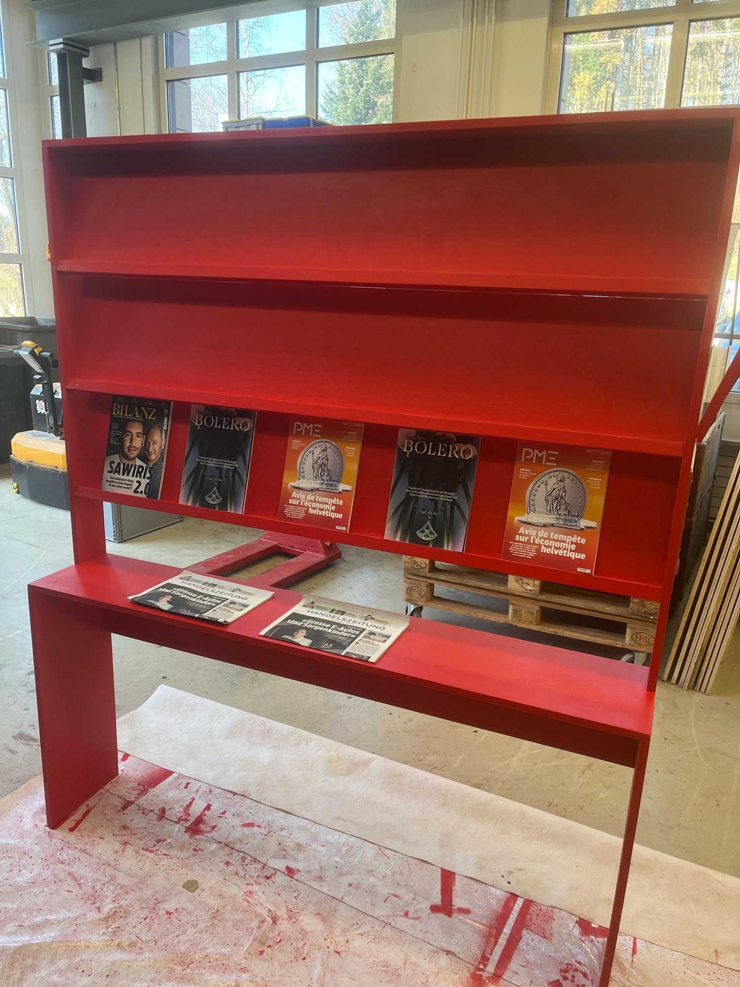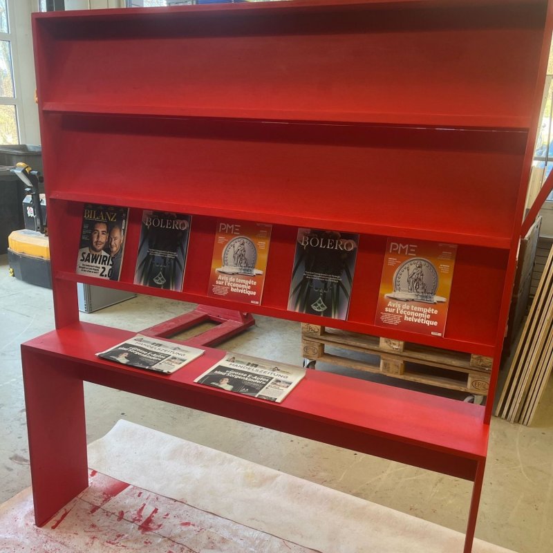 Das markante, rote BILANZ-Regal wurde inhouse bei made Marketing im CAD designt, geplant und anschliessend in unserer hauseigenen Werkstatt sorgfältig gefertigt und montiert. Besonderes Augenmerk lag auf den Abständen der Tablare, um eine optimale Präsentation der Magazine zu erzielen. Das fertige Display überzeugte durch Übersichtlichkeit und Wirkung – die Titel kamen zur Geltung und konnten fast schon museal präsentiert werden.