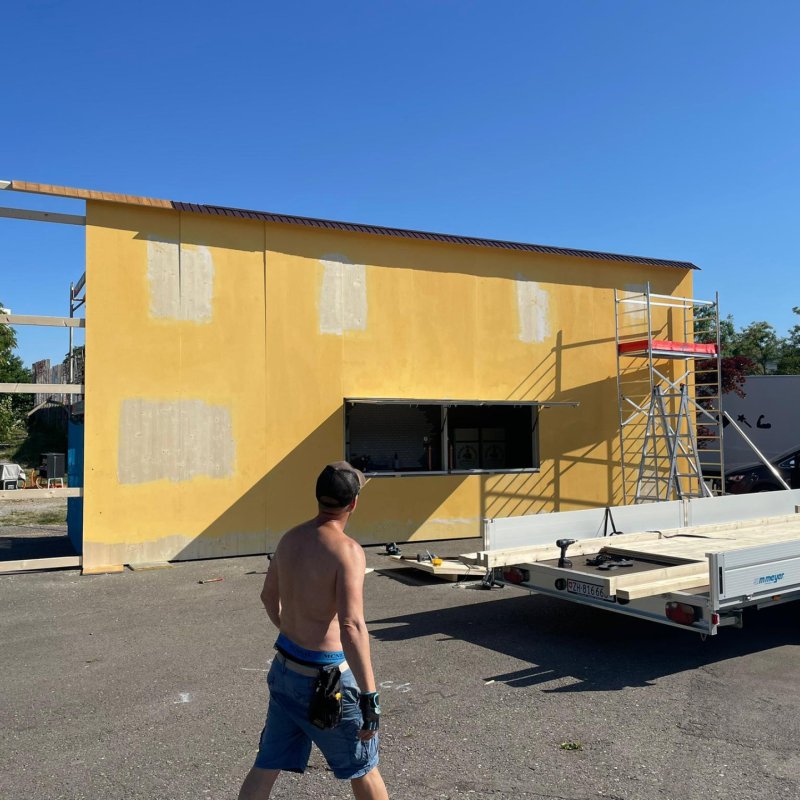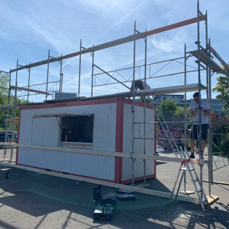 Schnell war klar, das Wetter musste mitspielen , wenn die Container angeliefert werden und die Fassade des Birra-Moretti-Haus mit Gerüst, Holz und Fenster verkleidet wird. Ansonsten drohte der Auftritt von Birra Moretti am Streetfoodfestival bereits vor Anlieferung bei der Hardturmbrache in Zürich buchstäblich ins Wasser zu fallen.
