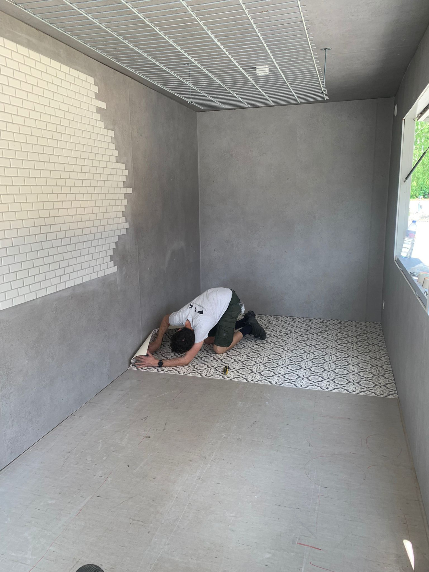 Nach dem Innenausbau des Containers folgte der Schwertransport zur Brache, da der Zusammenbau und die Fassadenverkleidung nur vor Ort stattfinden konnten. Hier waren vor allem zwei Dinge nicht gefragt: Regen und Höhenangst.