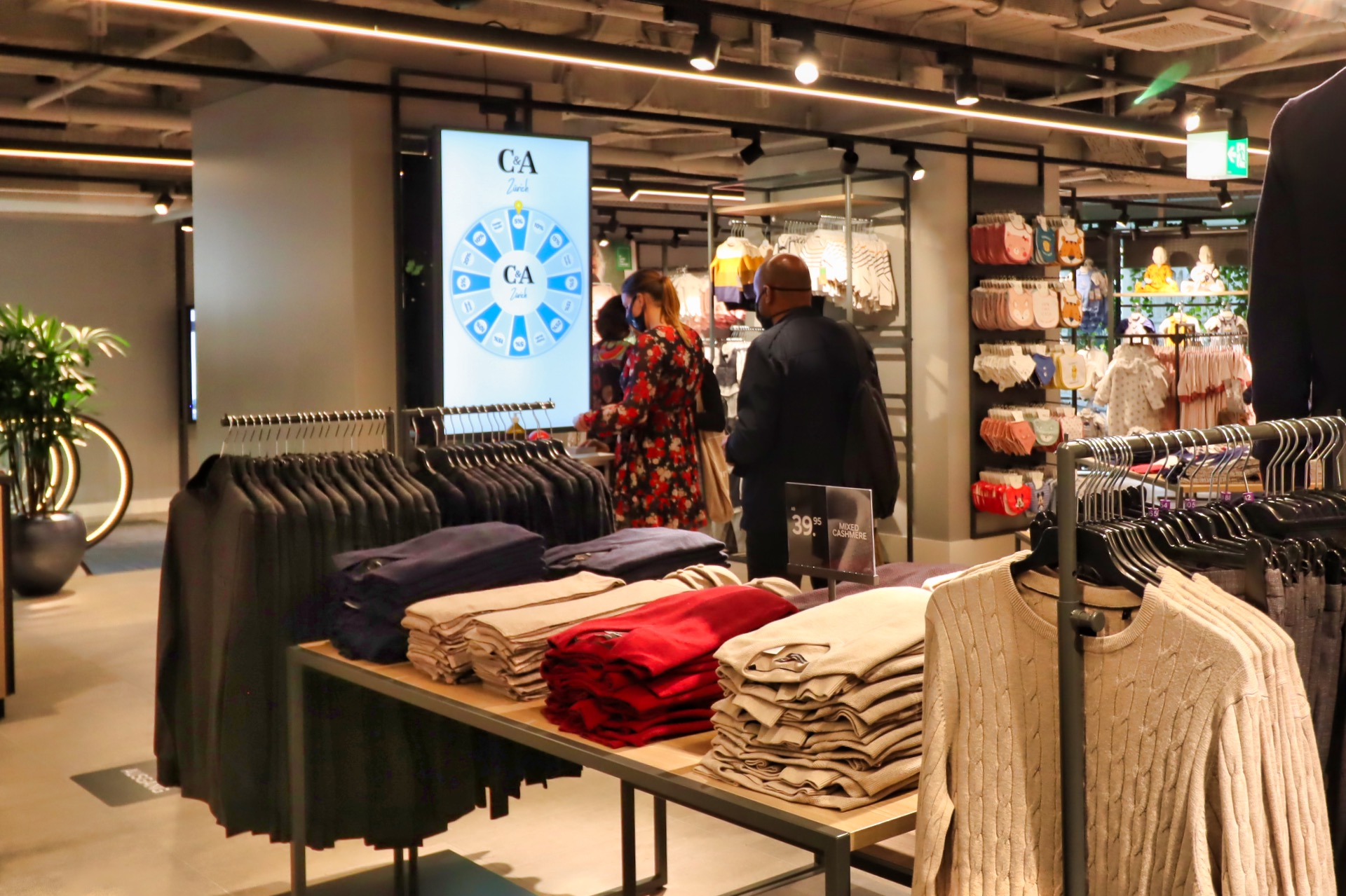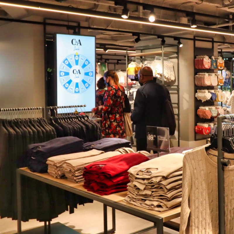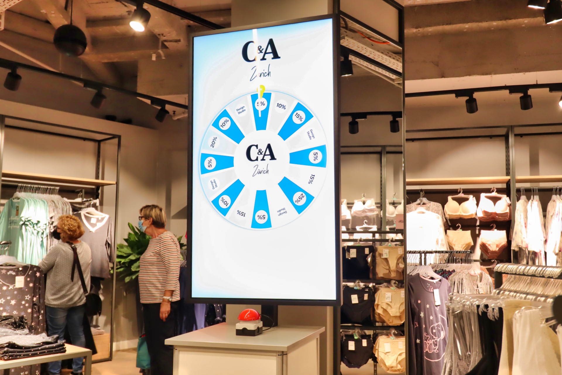 Zur Neueröffnung der C&A Filiale an der Zürcher Bahnhofstrasse wurde von uns ein digitales Glücksrad im neuen Look & Feel der Kleidermarke programmiert. Ziel war es, die potentiellen Kunden mit der Chance auf Rabatte zu belohnen. Mit 4617 Teilnehmern an den drei Eröffnungstagen wurde das Ziel erfolgreich erfüllt.