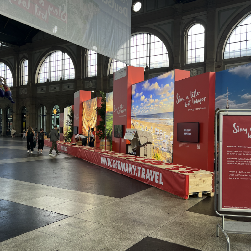 Bei dieser musealen Inszenierung im Hauptbahnhof Zürich standen gleich drei auffällige Eyecatcher im Mittelpunkt. Im Herzen der Aktivierung, passend zum Claim «Stay a little bit longer», befand sich eine 30 Meter lange Bank aus Palettenrahmen. Ein gigantisches XXL-Banner hing in beeindruckender Höhe von der Bahnhofshalle herab und sorgte für weite Sichtbarkeit. Zudem schufen 4 bis 5 Meter hohe, hinterleuchtete Wände eine warme, einladende Atmosphäre.