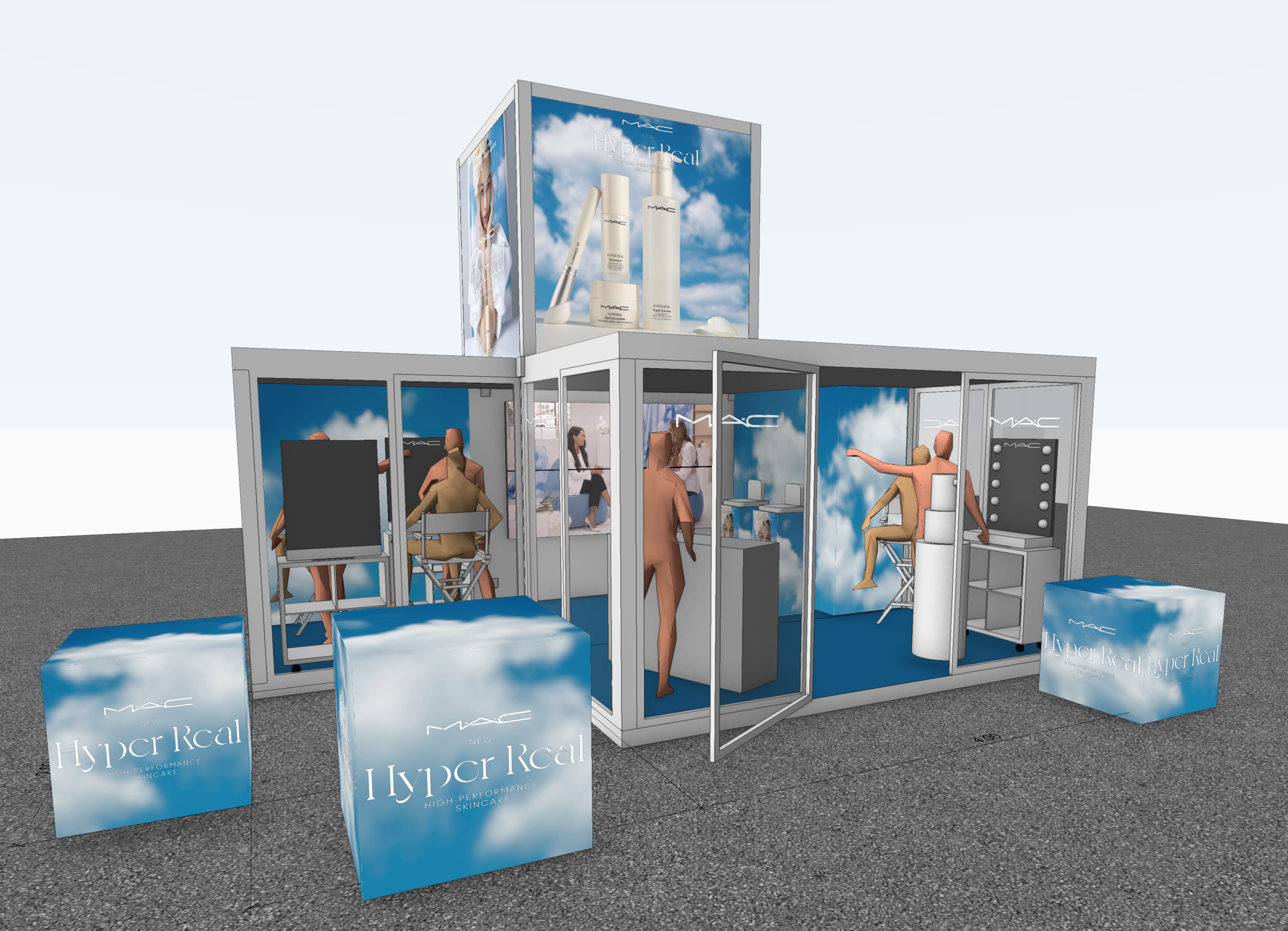 Durch das Erstellen von detaillierten Visualisierungen, konnte jeder Aspekt des Promocubes so ausgebaut werden, dass er mit der Markenidentität und der Produktlinie harmonierte und gleichzeitig den praktischen Anforderungen entsprach. Das Ergebnis war eine fesselnde und immersive Umgebung, welche Kunden dazu einlud, einzutreten und die Welt von Hyper Real zu erkunden.