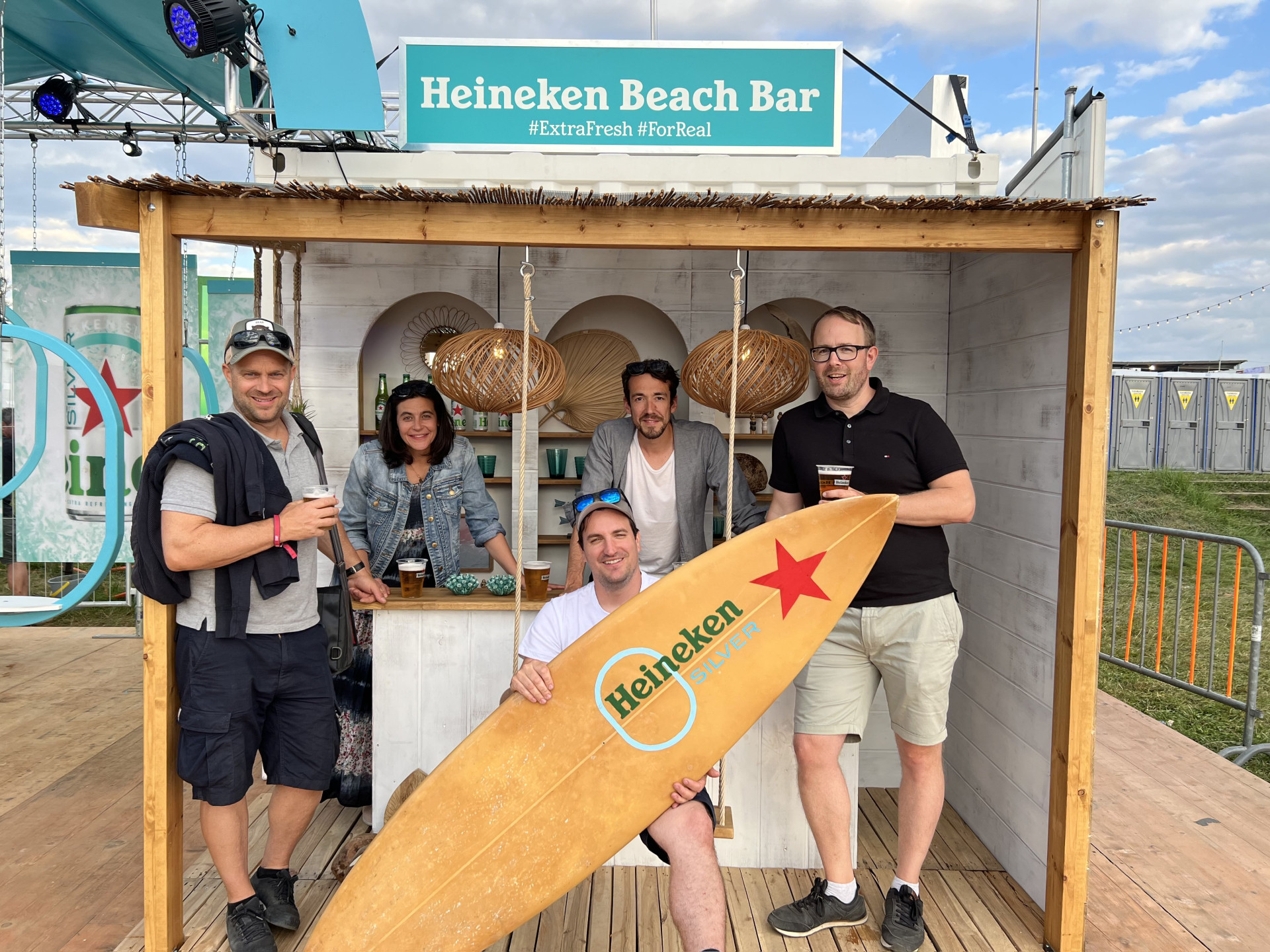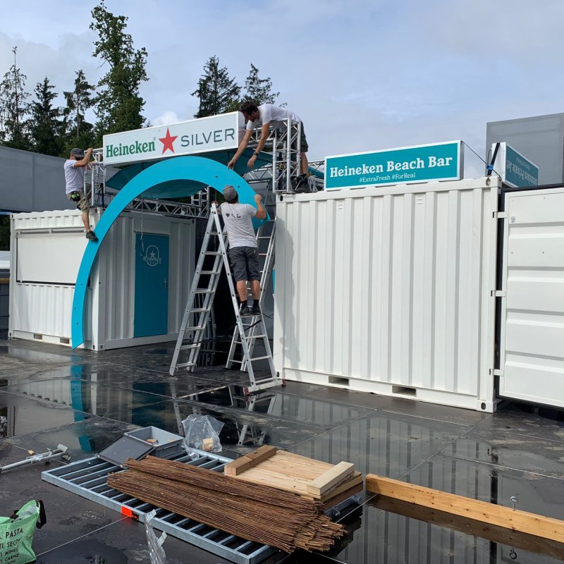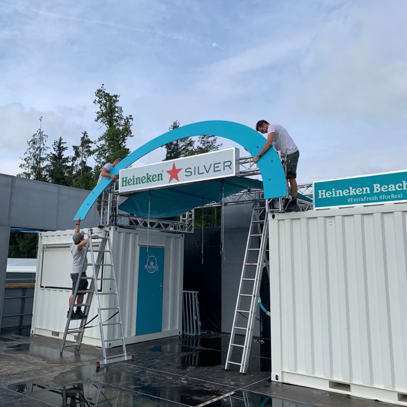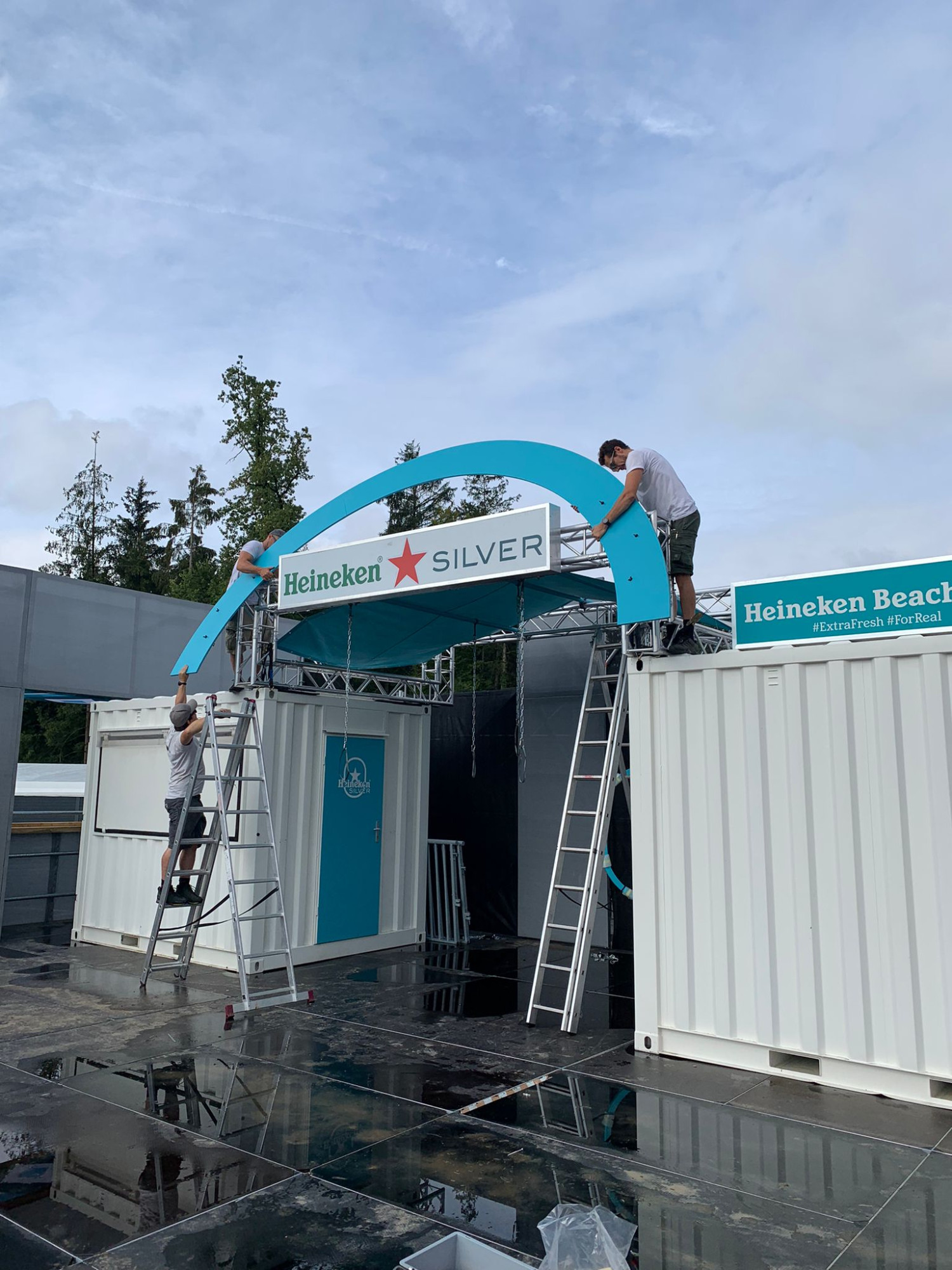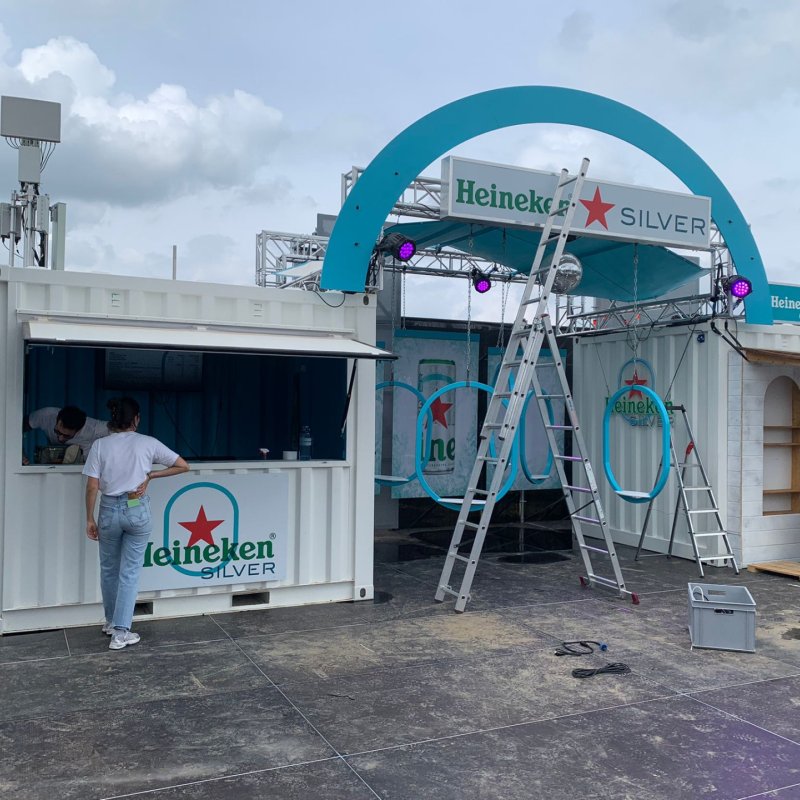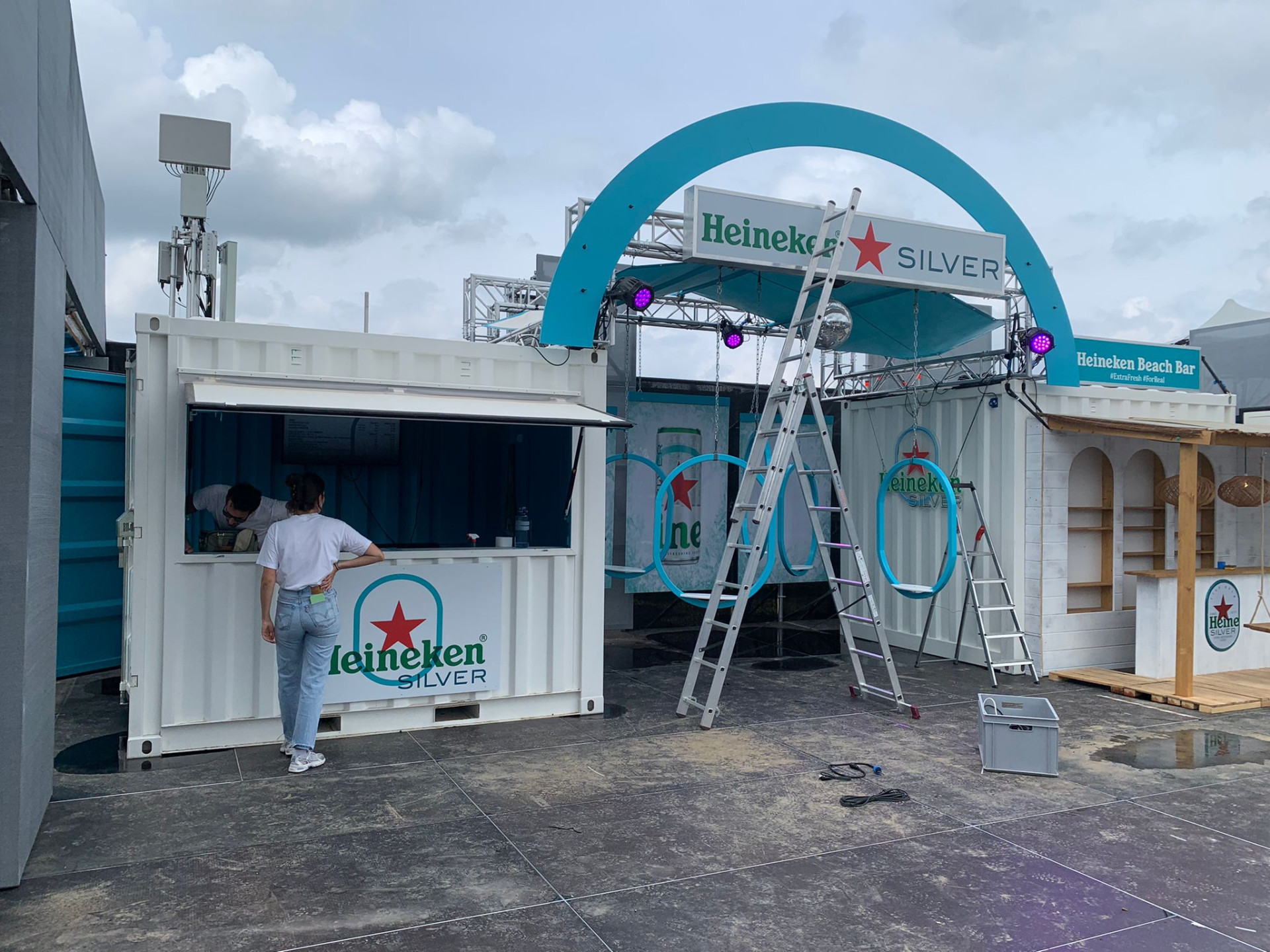 Die verkleideten Container dienten dem Auftritt von Heineken Silver an verschiedenen Festivals im Sommer 2022 als Unterbau. Ziel war es, die Besuchenden auf verschiedenen Ebenen zu überraschen. Als Eyecatcher dienten die Silver-Schaukeln und die karibische Strandbar. Etwas versteckt, die Privat-Jet-Installation als Überraschungselement.