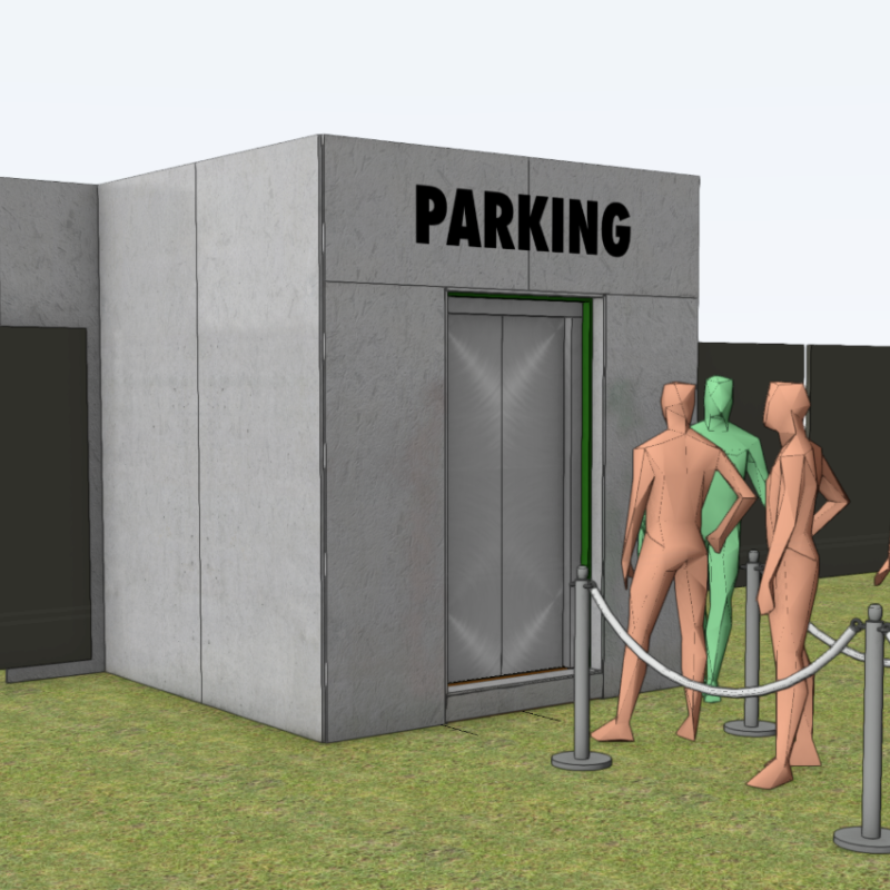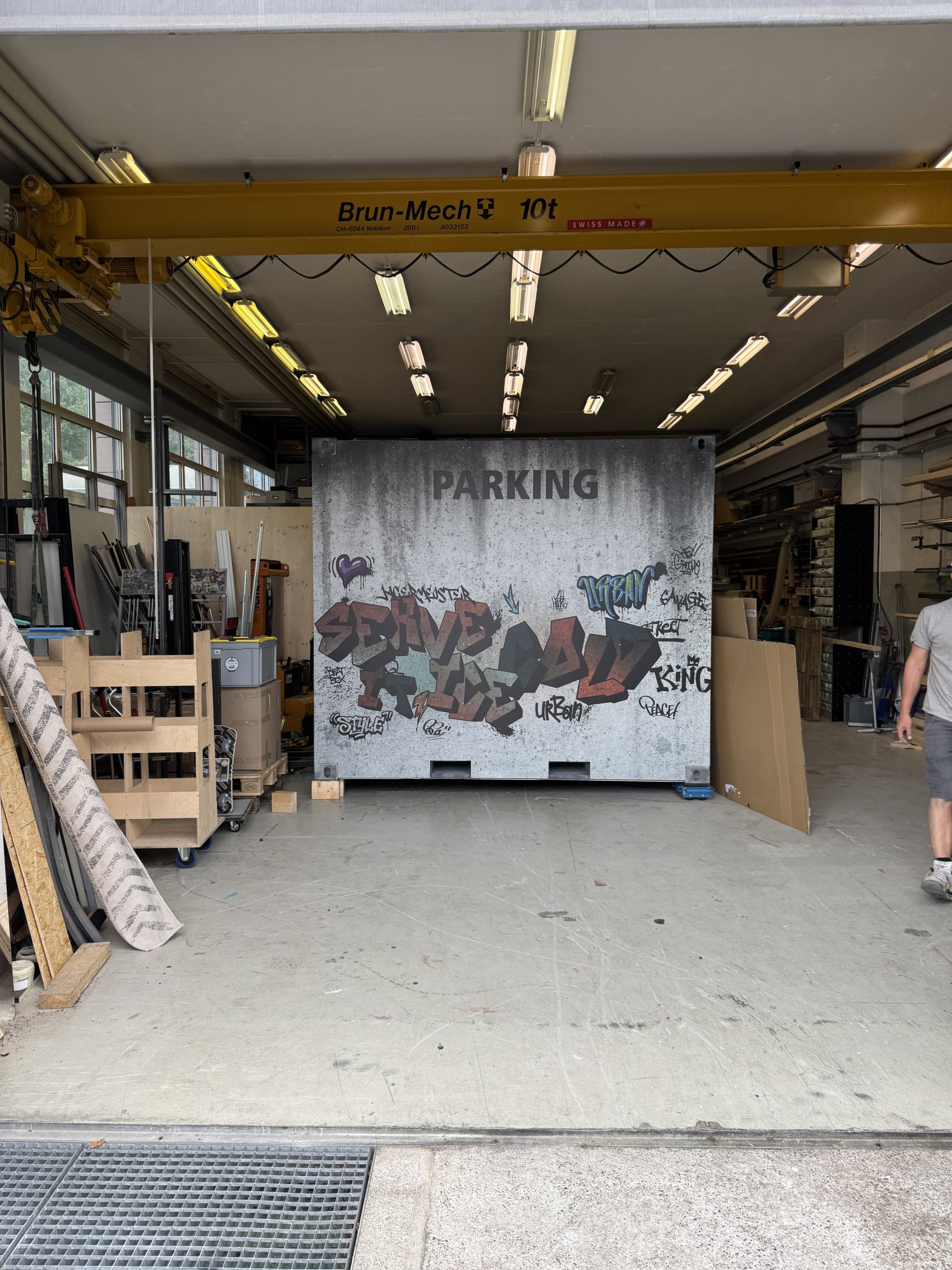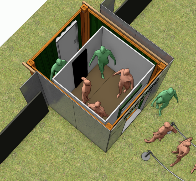 Der Container wurde von unserem Bauteam sorgfältig geprüft und umfassend überarbeitet. Für die authentische Umsetzung der Lift-Idee waren zahlreiche durchdachte und kreative Lösungen erforderlich. Um ein angenehmes Raumklima zu gewährleisten, wurde der Container von uns mit selbstklebender Isolierung ausgestattet. Der massgeschneiderte Aufbau erhielt zudem eine echte Lifttür sowie ein Rolltor, um ein möglichst realistisches Erscheinungsbild zu schaffen. Der Knopfmechanismus, die Audiosteuerung und das Lichtsystem erforderten viel Tüftelei, Präzision und Feingefühl. Um einen reibungslosen Ablauf zu gewährleisten, wurde ein separater Operatorraum integriert, der über eine "hidden door" zugänglich ist.