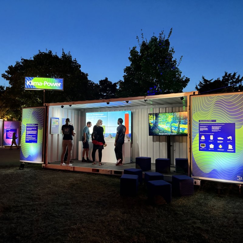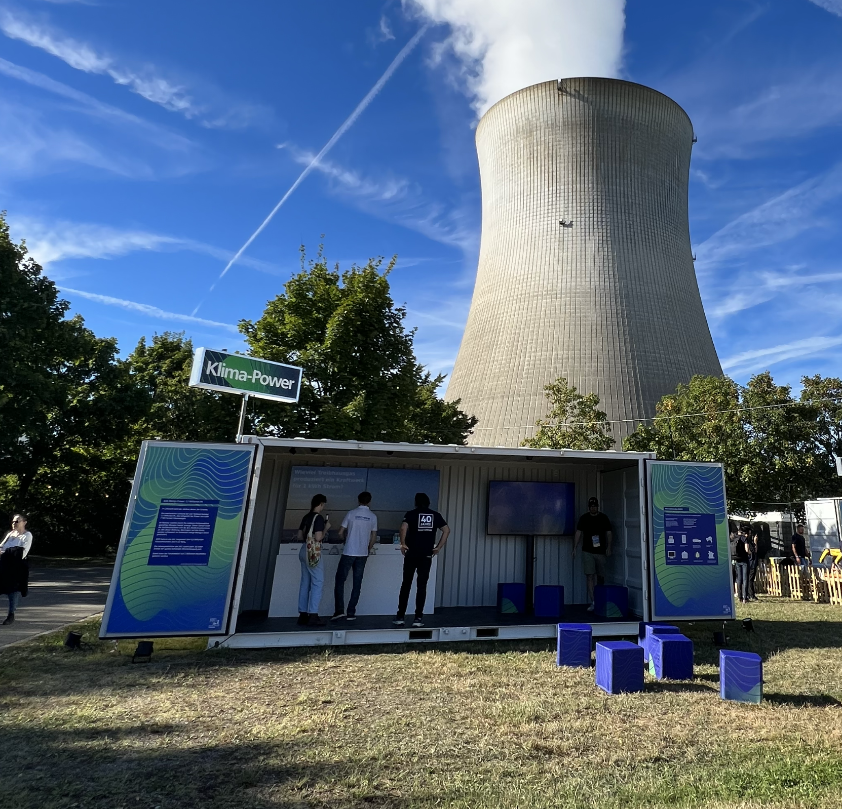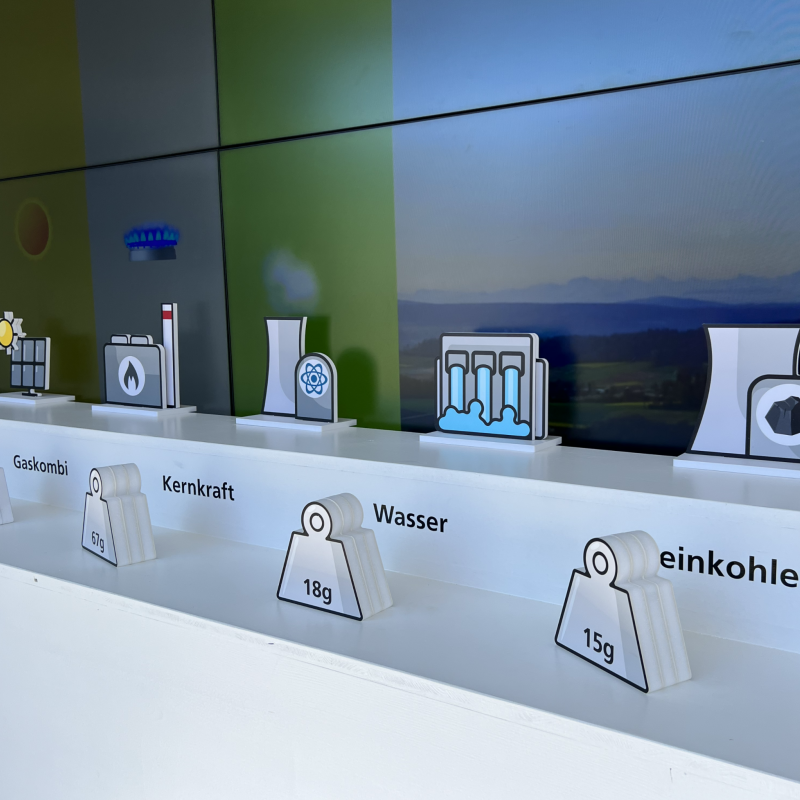In dieser Station wurde die Kraft der Energietechnologie spürbar. «Mit dem stärksten Motor der Schweiz (1,7 Millionen PS) wird in Leibstad klimafreundlich Energie produziert», so die Botschaft dieses Stand-Elements. BesucherInnen konnten anhand eines spielerischen Ansatzes verstehen, wie die verschiedenen Kraftwerkstypen Enfluss auf den CO-Ausstoss nehmen.