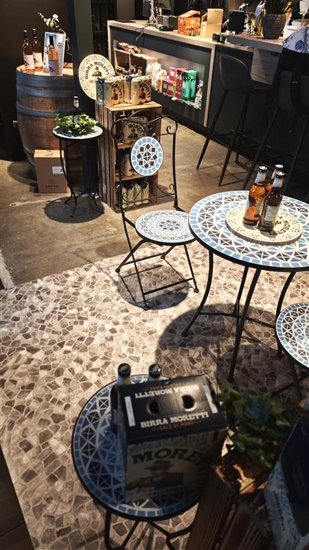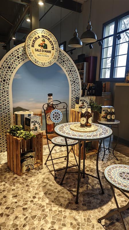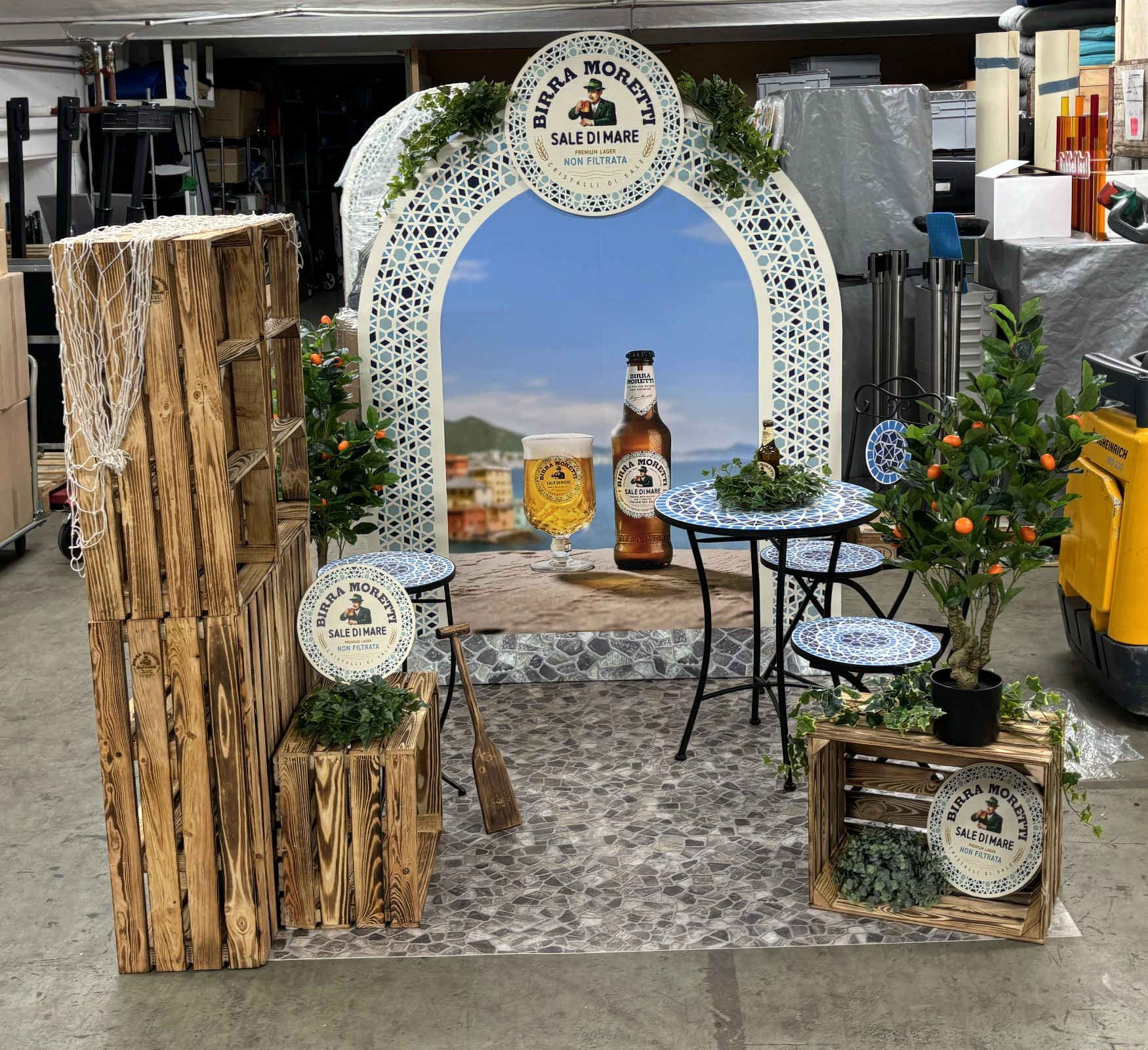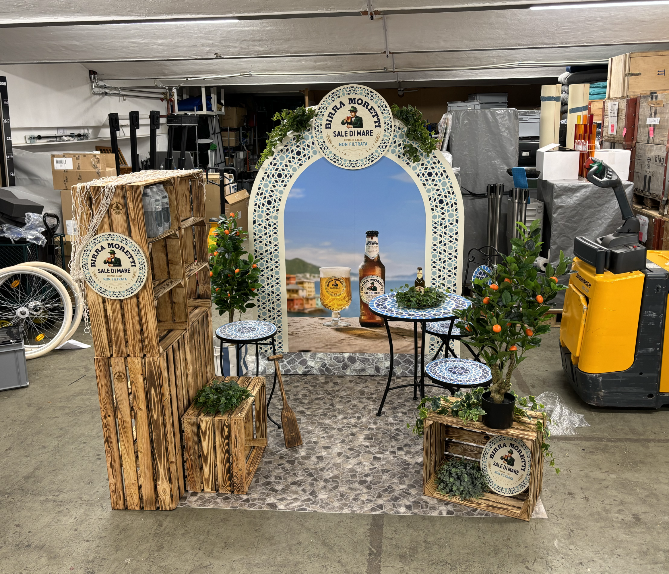 Italienischer Plaza-Look und gemeinsames Anstossen werden bei Birra Moretti grossgeschrieben. Der Torbogen und die Keramiktische unterstreichen den mediterranen Flair, während Orangenbäume und Holzkisten das Gesamtbild harmonisch abrunden.