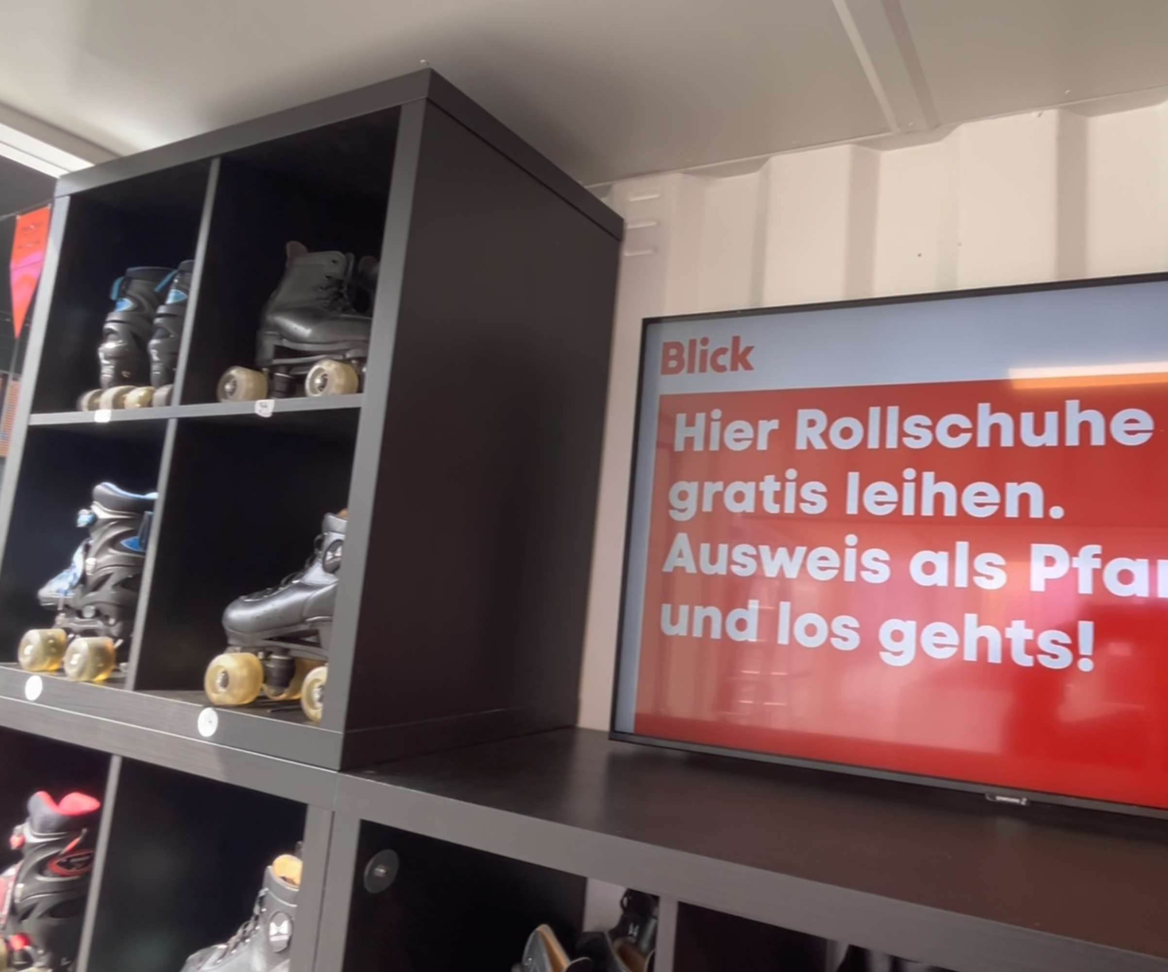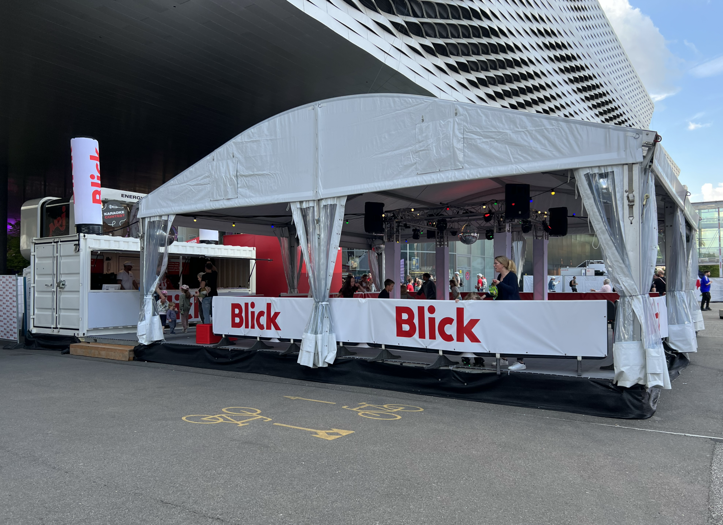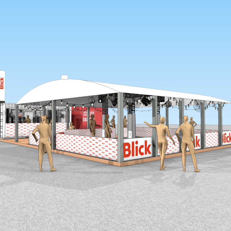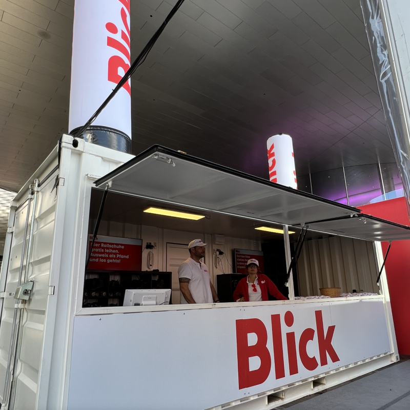 Die meiste Fläche am Stand wurde von der 80m2 grossen Rollschuhdisco eingenommen. Mit Musik und Lichteffekten entstand eine lebendige, spaßige Atmosphäre auf der Tanzfläche, die zu ausgelassener Interaktion einlud. Direkt am Container neben der Theke konnten sich die Besucher Rollschuhe ausleihen. Sowohl der Container als auch das Zelt fügten sich optisch ansprechend in das Gesamtbild des CI/CD von Blick ein.