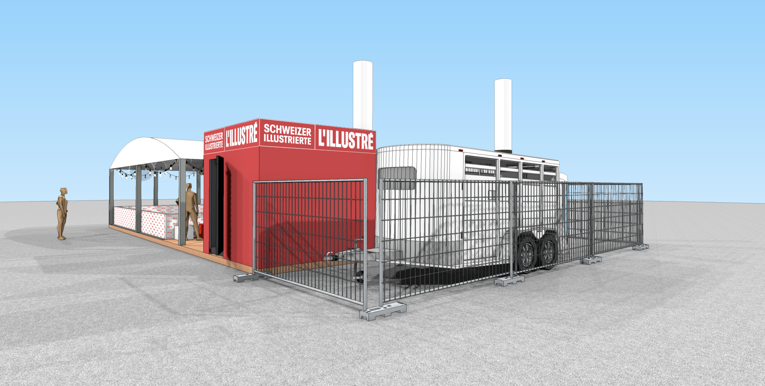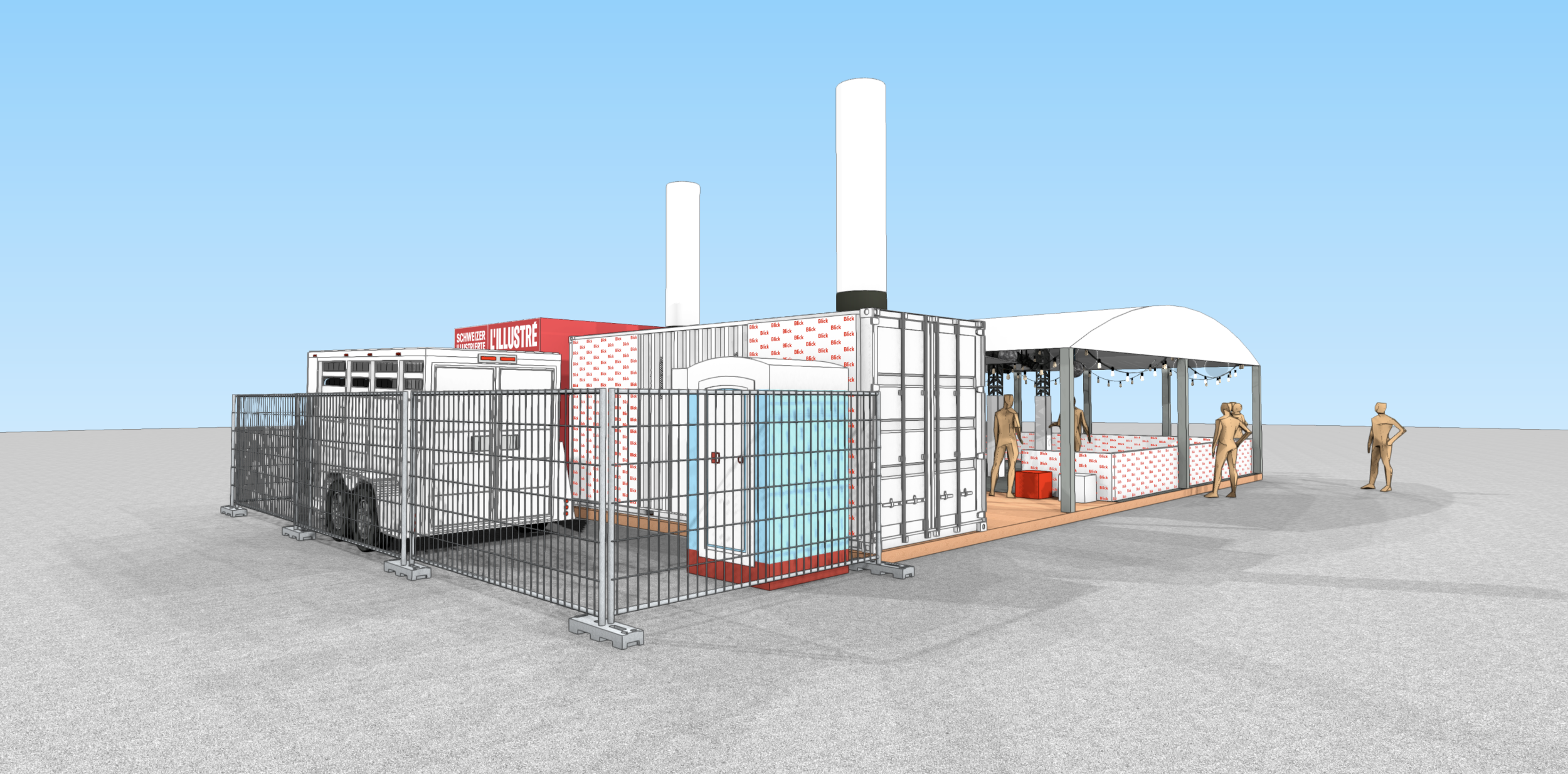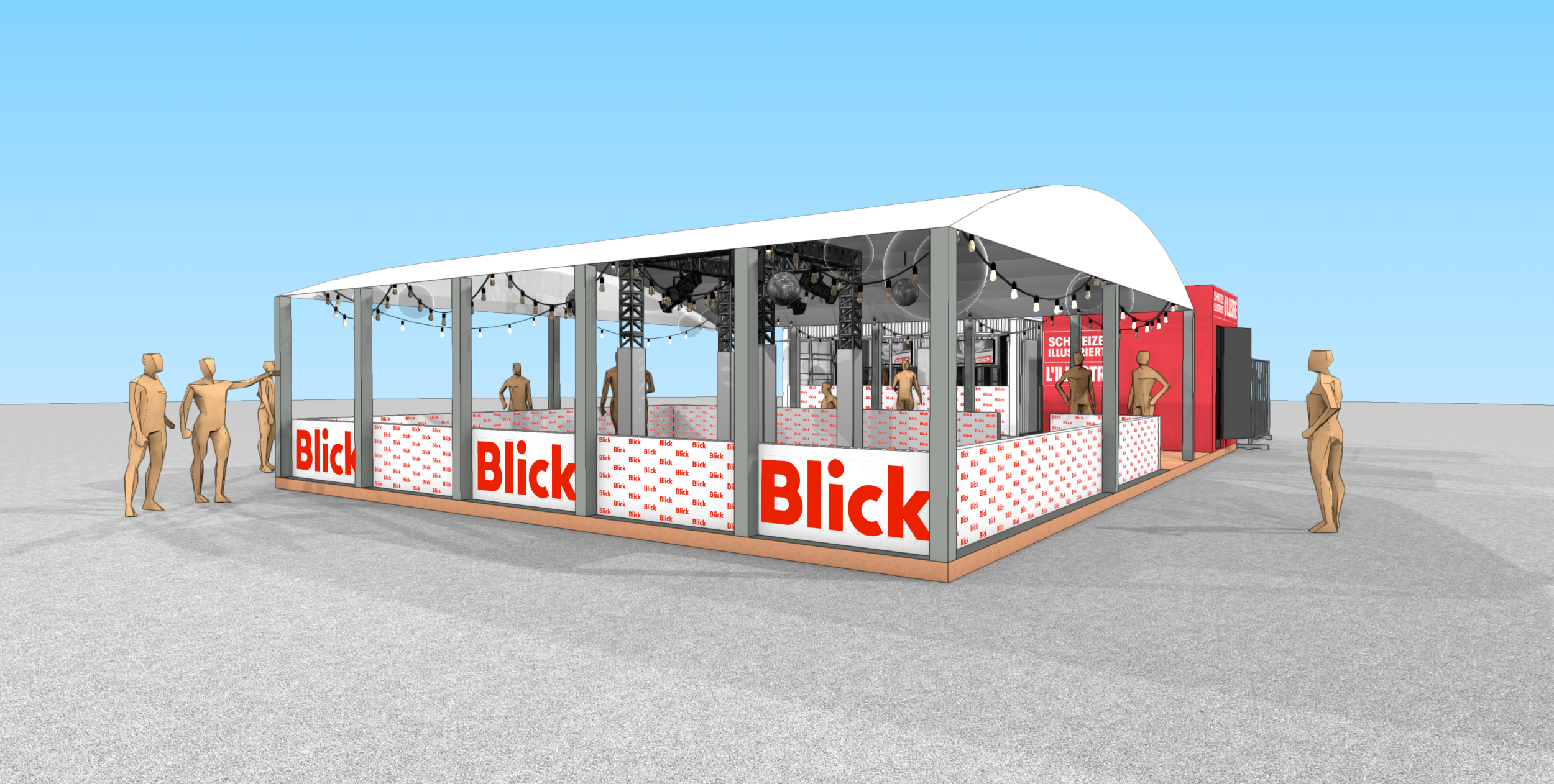 Die meiste Fläche am Stand wurde von der 80m2 grossen Rollschuhdisco eingenommen. Mit Musik und Lichteffekten entstand eine lebendige, spaßige Atmosphäre auf der Tanzfläche, die zu ausgelassener Interaktion einlud. Direkt am Container neben der Theke konnten sich die Besucher Rollschuhe ausleihen. Sowohl der Container als auch das Zelt fügten sich optisch ansprechend in das Gesamtbild des CI/CD von Blick ein.