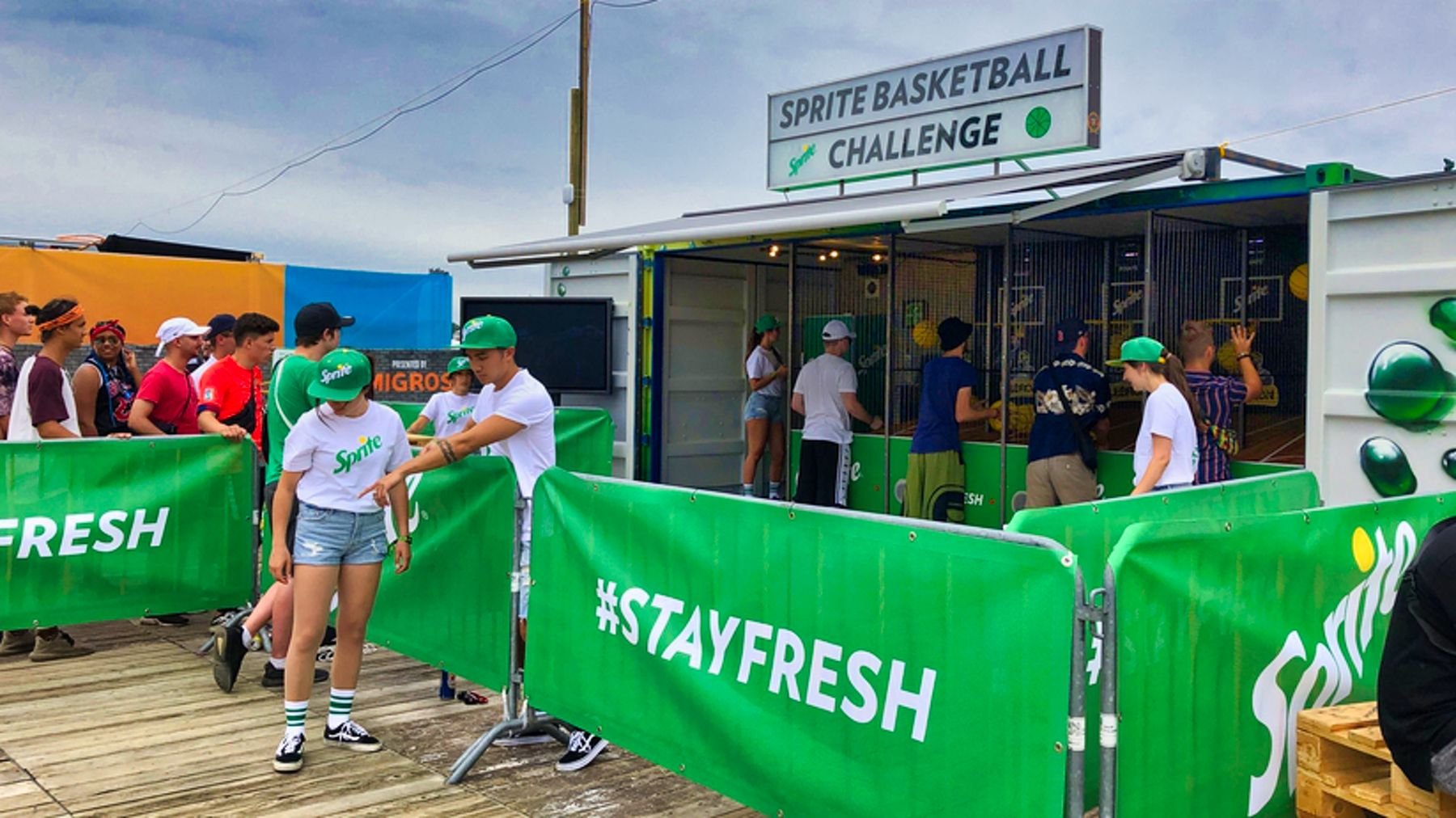 Bis zu vier Gegner(Innen) können in der Sprite Basketball Challenge gegeneinander antreten. Ein Knopf löst den Countdown aus und es gilt, schiessen und treffen – möglichst viel. Dem Gewinner der Challenge winkt ein Preis, die anderen dürfen ein Sprite probieren. Lachen, Schwitzen, Pusten, sich auf die Schultern klopfen, Fotografieren... die analog anmutende Challenge mit Muskelkraft kommt beim Publikum sehr gut an.