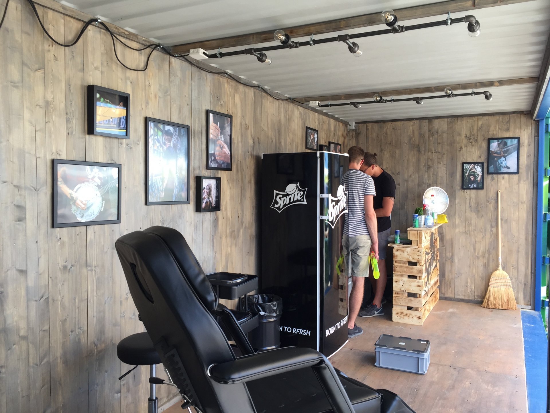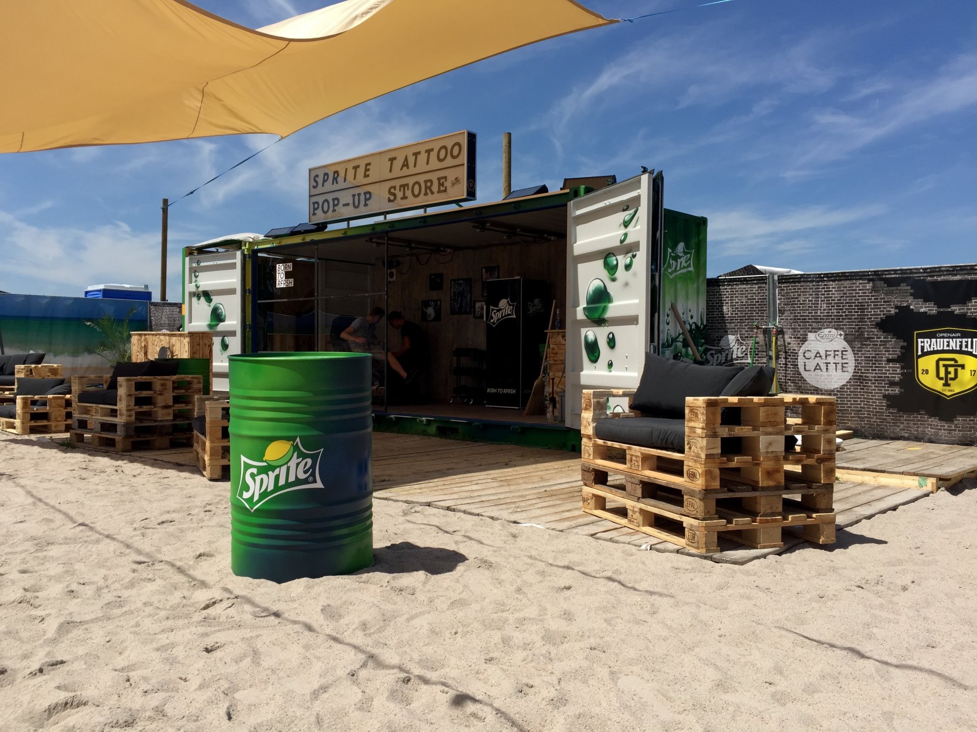 Schweisshände gab es nicht nur beim Aufbau in sengender Hitze, auch die (temporär) Tattoo-Willigen konnten dank authentischem Bau, Geruch und Atmosphäre die Tätowierstudioluft förmlich spüren. Auf- und abgebaut wurde der Festivalauftritt von Sprite am Openair Frauenfeld sowie in der Royal Arena Biel und am Urban Festival Lausanne.