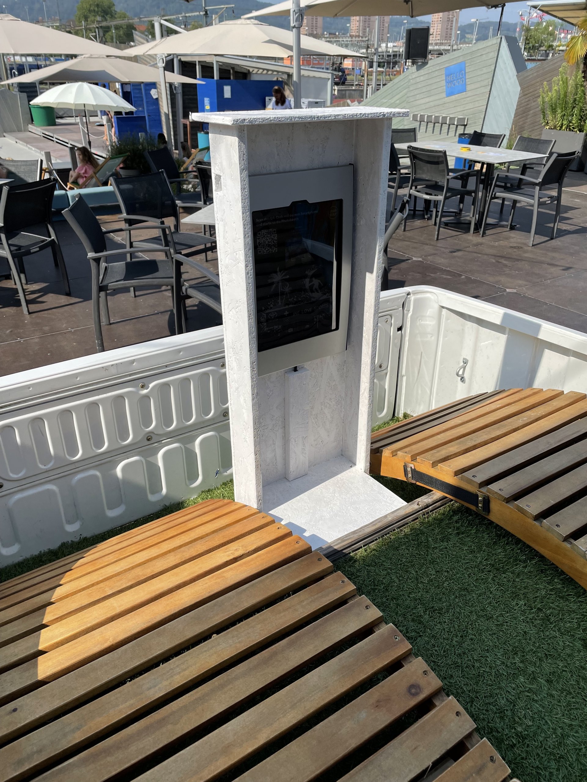 Entstanden ist eine elegante in Holz eingefasste Selfclick-Box, die sich wunderbar in die Szenerie rund um die Urbansurf-Welle einfügt und natürlich die von Toyota genannten Vorgaben erfüllt.