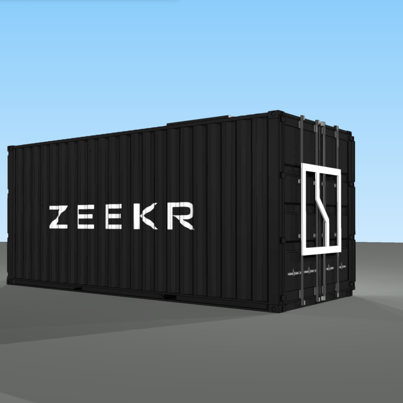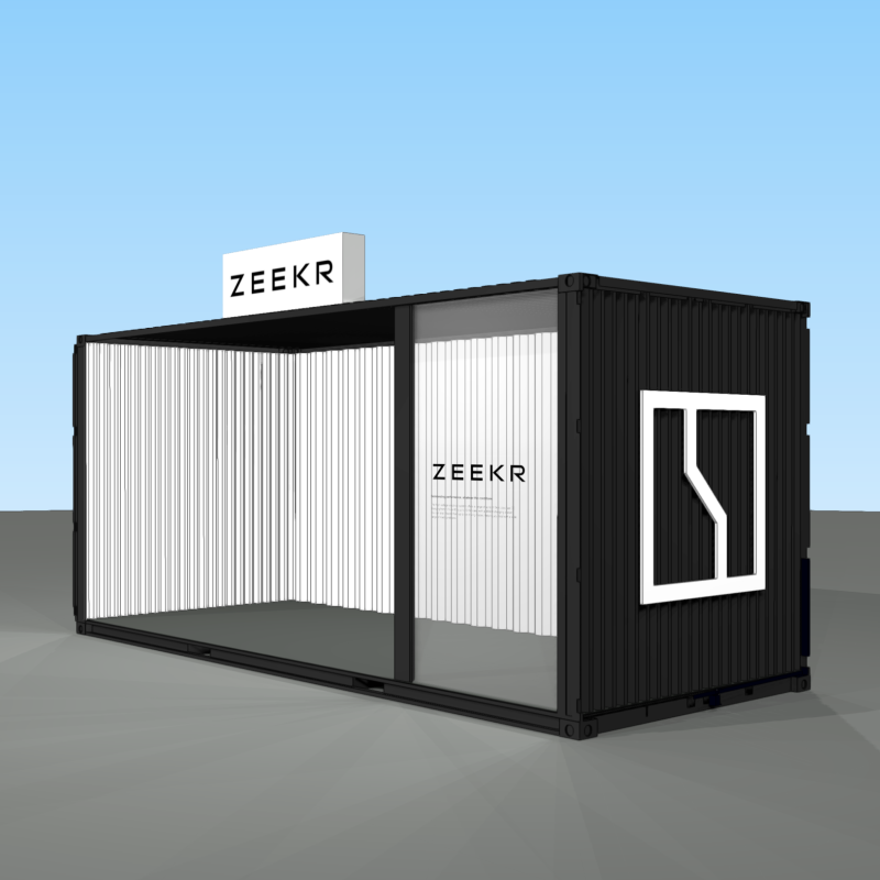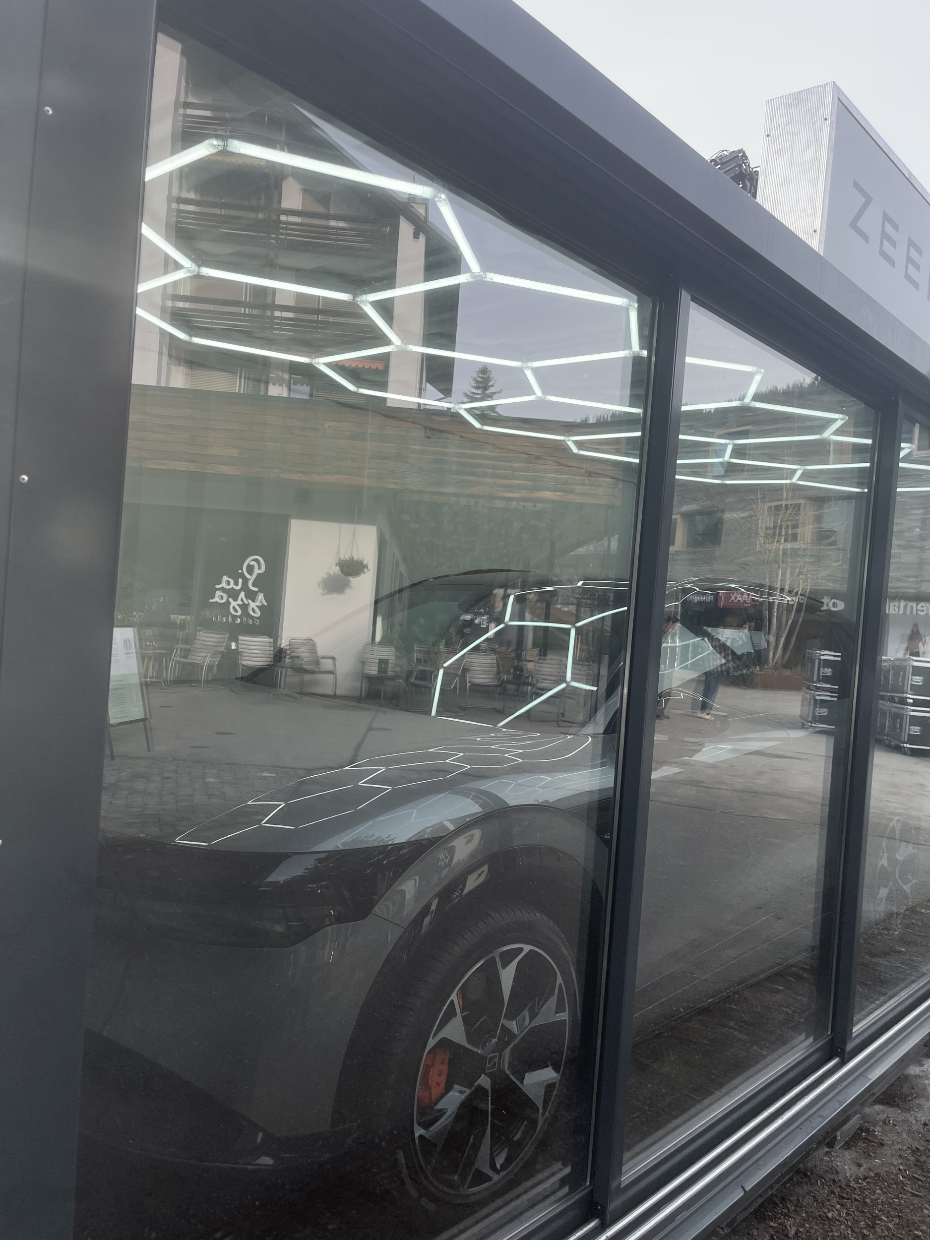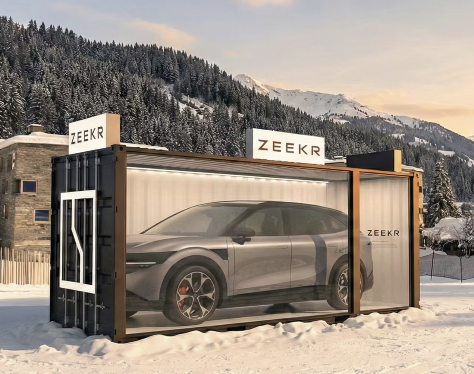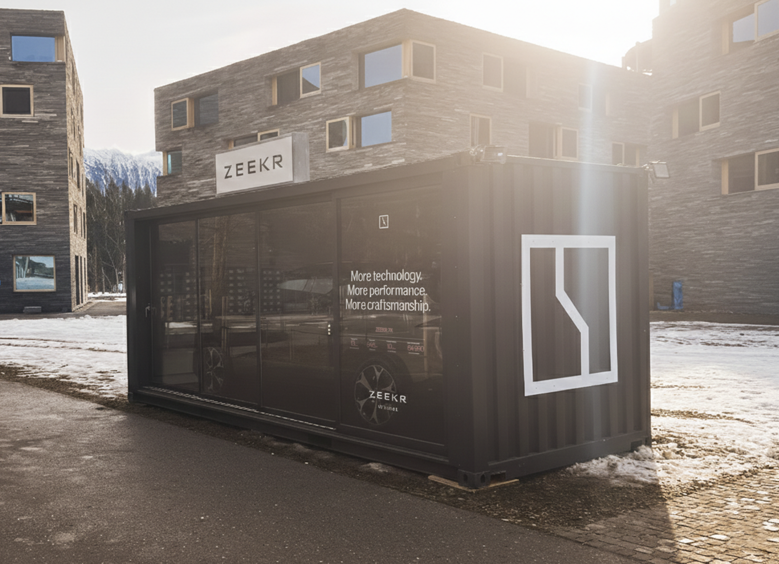 Ein eleganter Container inszeniert als wetterfeste Hülle das Zeekr-Auto-Modell in den Bündner Bergen.