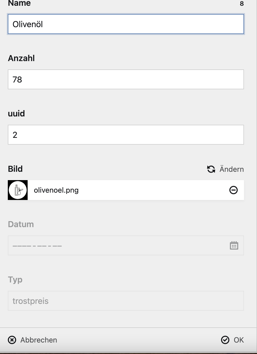 Preis (Linie anklicken), um die Anzahl anzupassen. Die Anzahl definiert die Auftrittswahrscheinlichkeit des Preises. Wird der Wert auf 0 gesetzt, erscheint der Preis nicht mehr auf dem Glücksrad. Nach der Änderung mit OK bestätigen.