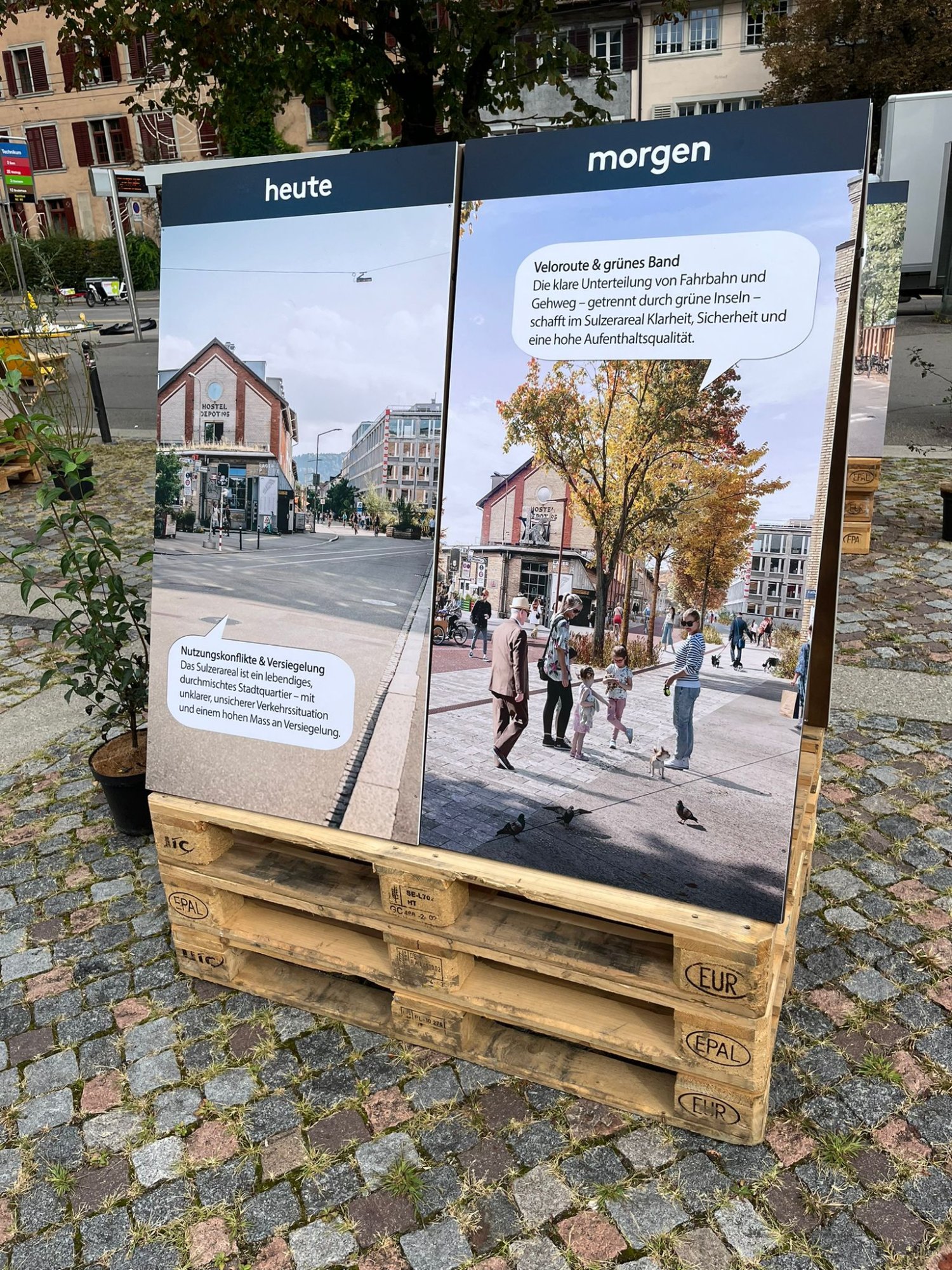 Im Aussenbereich um den Cube fand eine Aussenaustellung der Stadt Winterthur zum Thema "Mobilität im Wandel" statt. Ziel war es, verschiedene Strassensituation in einem Vorher-Nachher-Vergleich zu zeigen. Unsere Aufgabe war es, Vorschläge einzubringen, wie diese Aussenausstellung den Kriterien der Stadt entsprechen kann. Mit den Paletten und Kundenstoppern fanden wir eine nachhaltige, platzsparende, wetterfeste Lösung, die immer wieder eingesetzt werden kann.