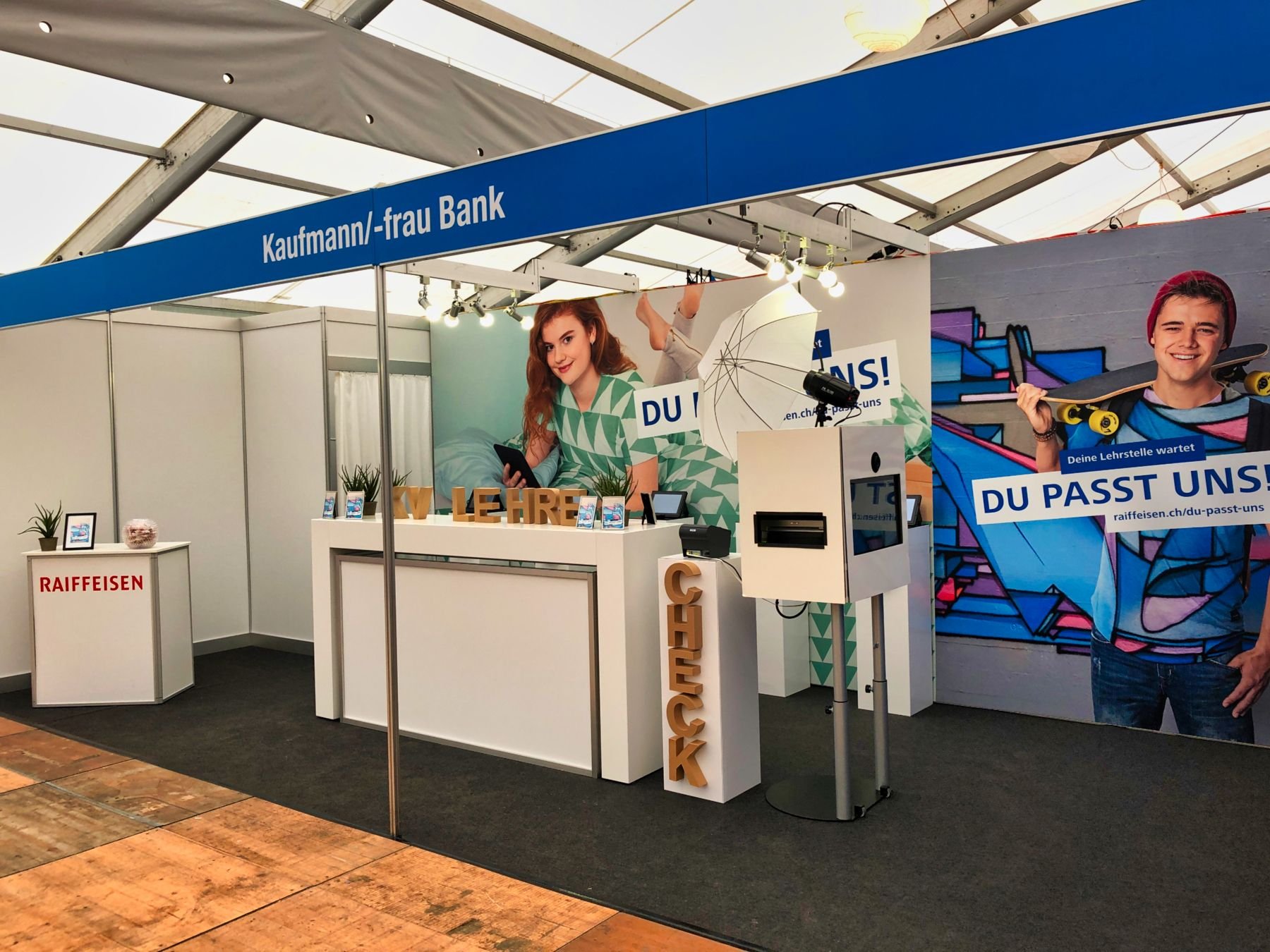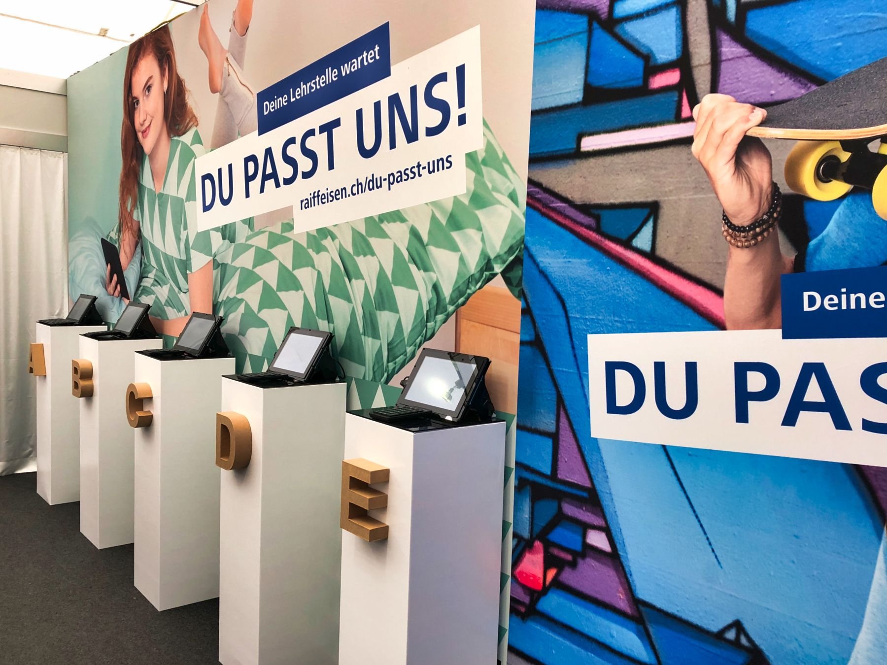 Vorgabe war es, das Werbesujet der Raiffeisen «Du passt uns!» einfliessen zu lassen. Unsere Lösung war die Entwicklung eines Typenquiz', mit ehrlicher Auswertung. Die Palette reichte von A - wie «Du passt uns! Bewirb Dich für eine Lehrstelle» bis D - wie «Hey, vielleicht interessiert Dich eher ein anderer Beruf». Wer den Typentest absolvierte, konnte sich in das Design der Kampagne stellen und sich für ein Foto ablichten lassen. Mit Hülle, Lanyard und dem Resultat auf der Rückseite des Fotos, war gleich auch ein mit Namen personalisiertes Give Away vorhanden.