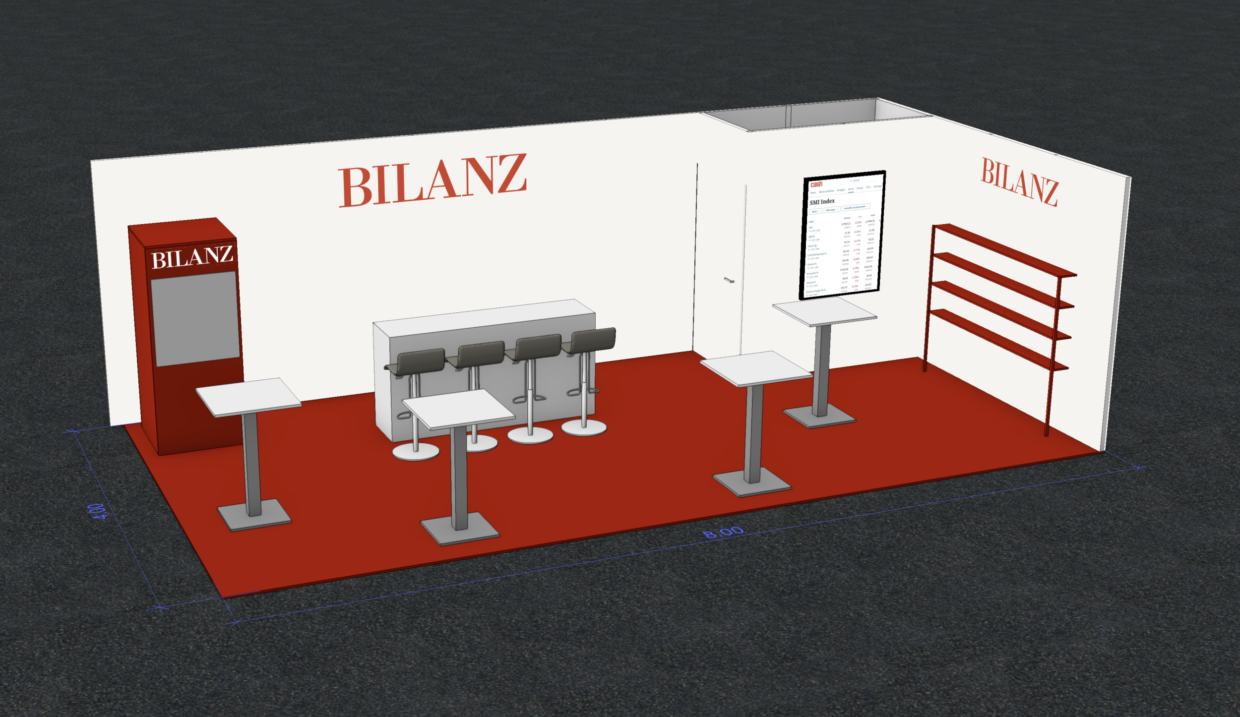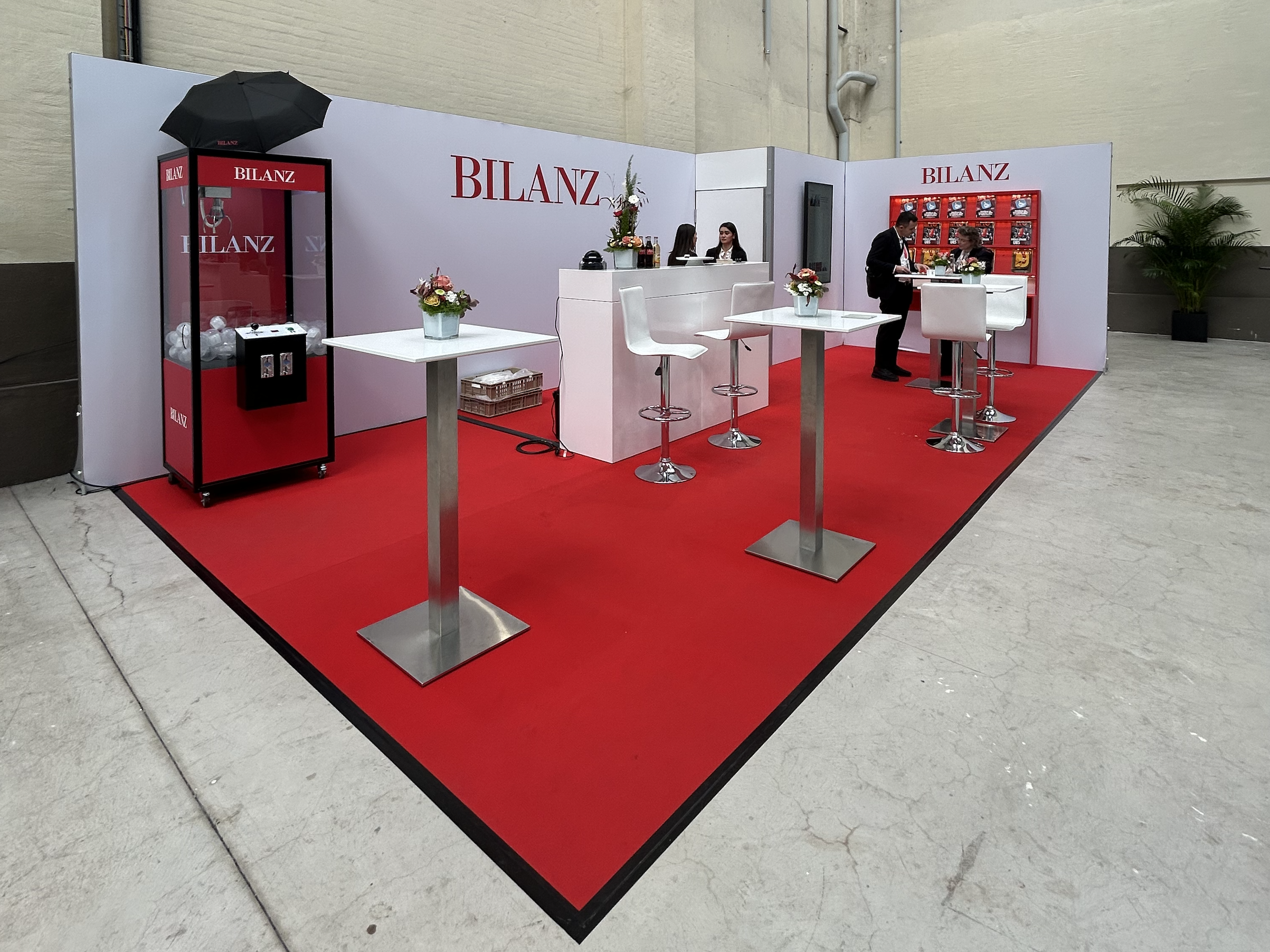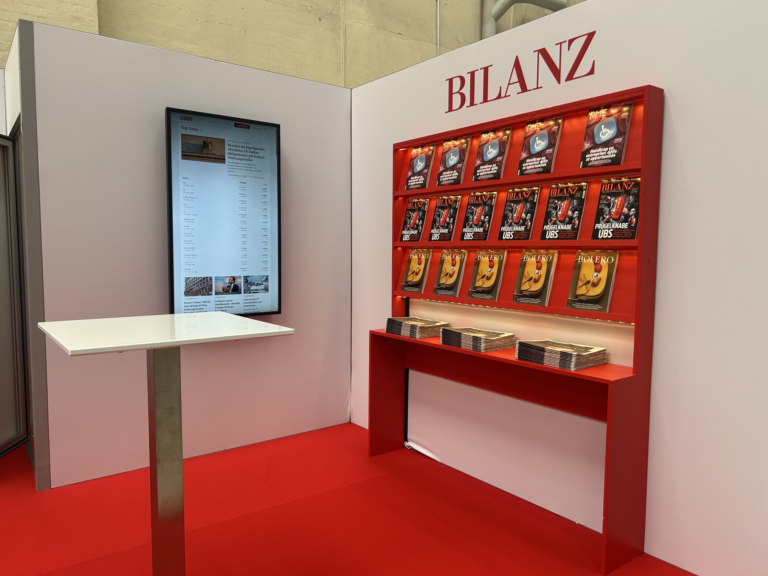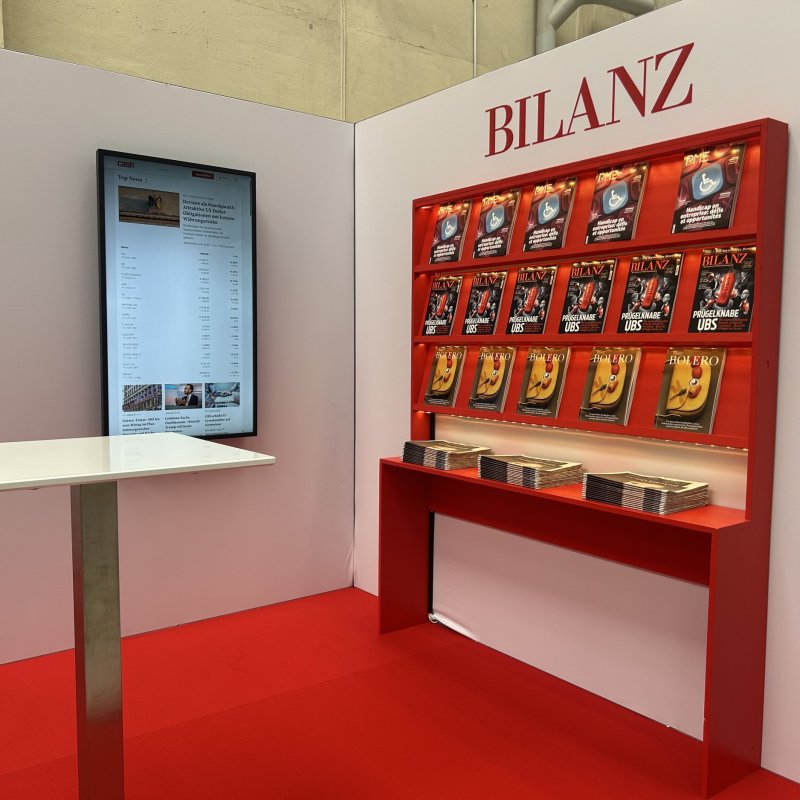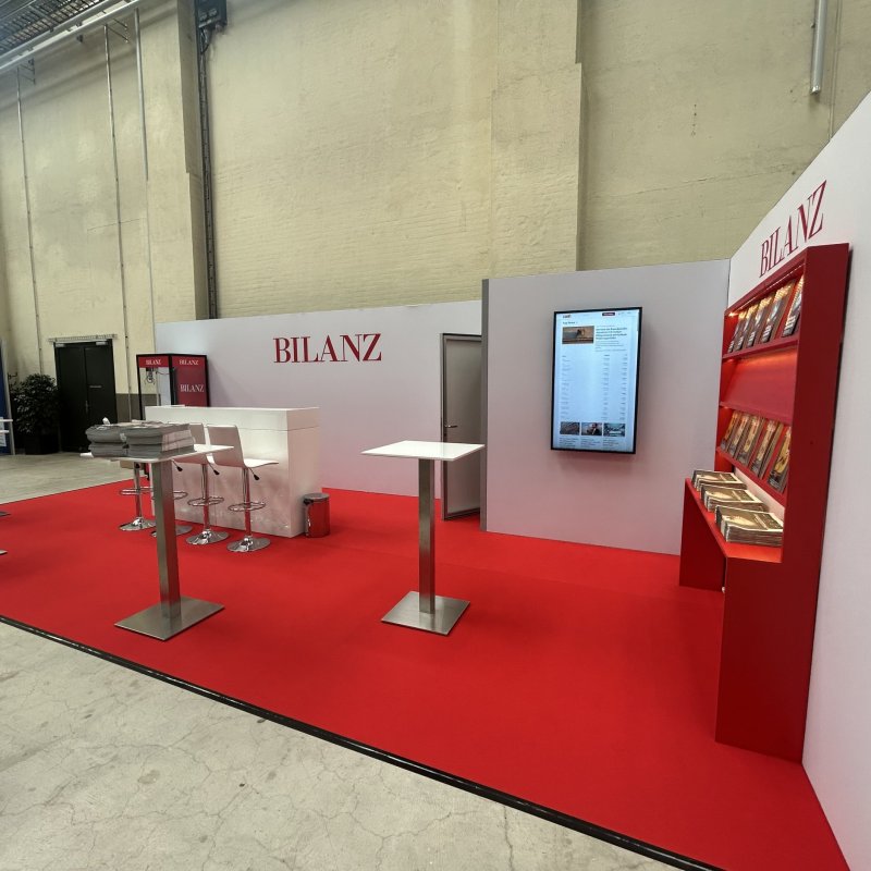 Umsetzung eines frischen und ansprechenden Standkonzepts für einen Messestand, inkl. Aktivierung, Bar-Mobiliar und rotem Regal mit integrierter LED-Schiene als Displayfläche für Magazine. Stärkung der Markenpräsenz der Zeitschrift BILANZ als Hauptbrand der Wirtschaftsmedien.