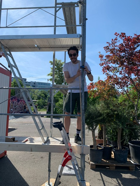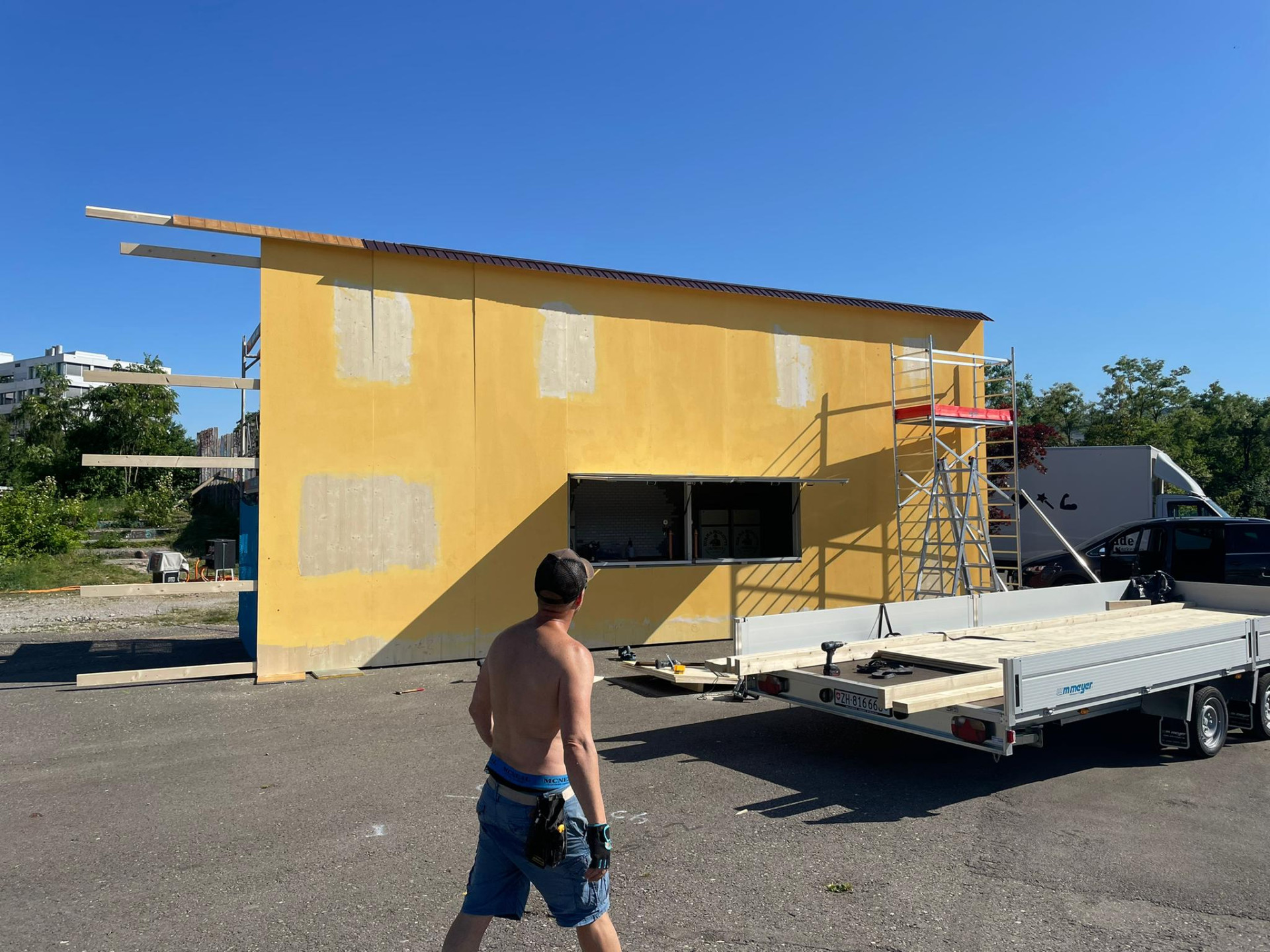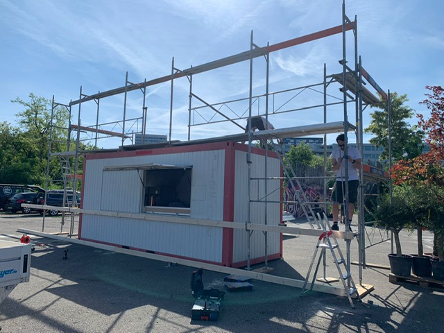 Schnell war klar, das Wetter musste mitspielen , wenn die Container angeliefert werden und die Fassade des Birra-Moretti-Haus mit Gerüst, Holz und Fenster verkleidet wird. Ansonsten drohte der Auftritt von Birra Moretti am Streetfoodfestival bereits vor Anlieferung bei der Hardturmbrache in Zürich buchstäblich ins Wasser zu fallen.