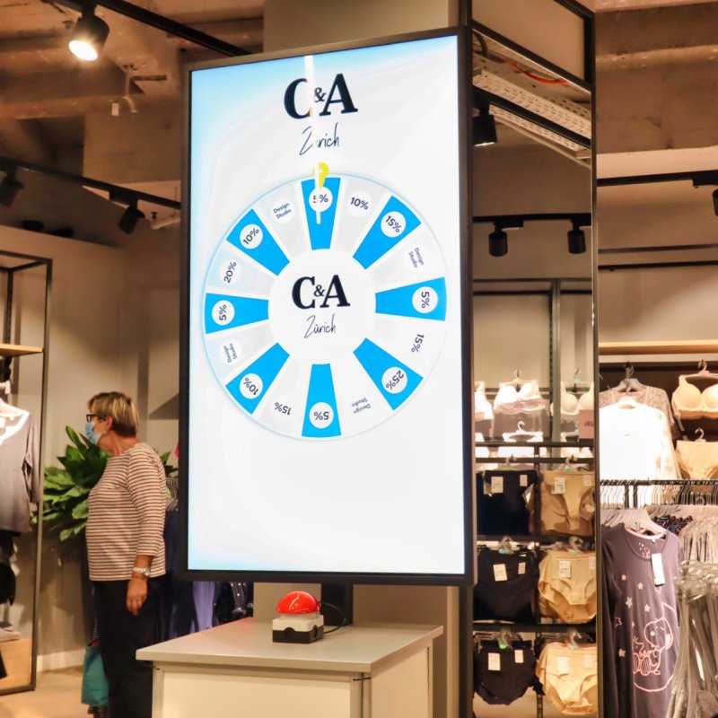 Zur Neueröffnung der C&A Filiale an der Zürcher Bahnhofstrasse wurde von uns ein digitales Glücksrad im neuen Look & Feel der Kleidermarke programmiert. Ziel war es, die potentiellen Kunden mit der Chance auf Rabatte zu belohnen. Mit 4617 Teilnehmern an den drei Eröffnungstagen wurde das Ziel erfolgreich erfüllt.