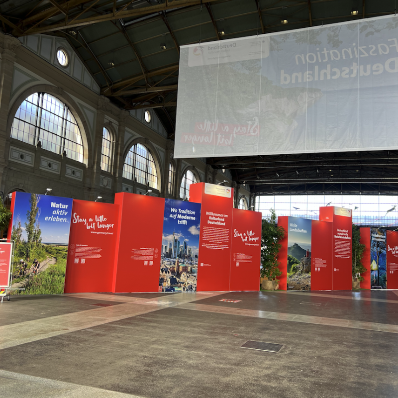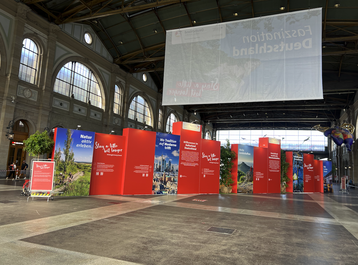 Nach dem Prinzip «Mehr ist mehr» haben wir die imposante Bahnhofshalle mit szenografischen Elementen in Szene gesetzt, indem wir den Raum sowohl von oben – mit dem XXL-Banner – als auch von unten – mit Messebau und der Bank – vollständig nutzten.