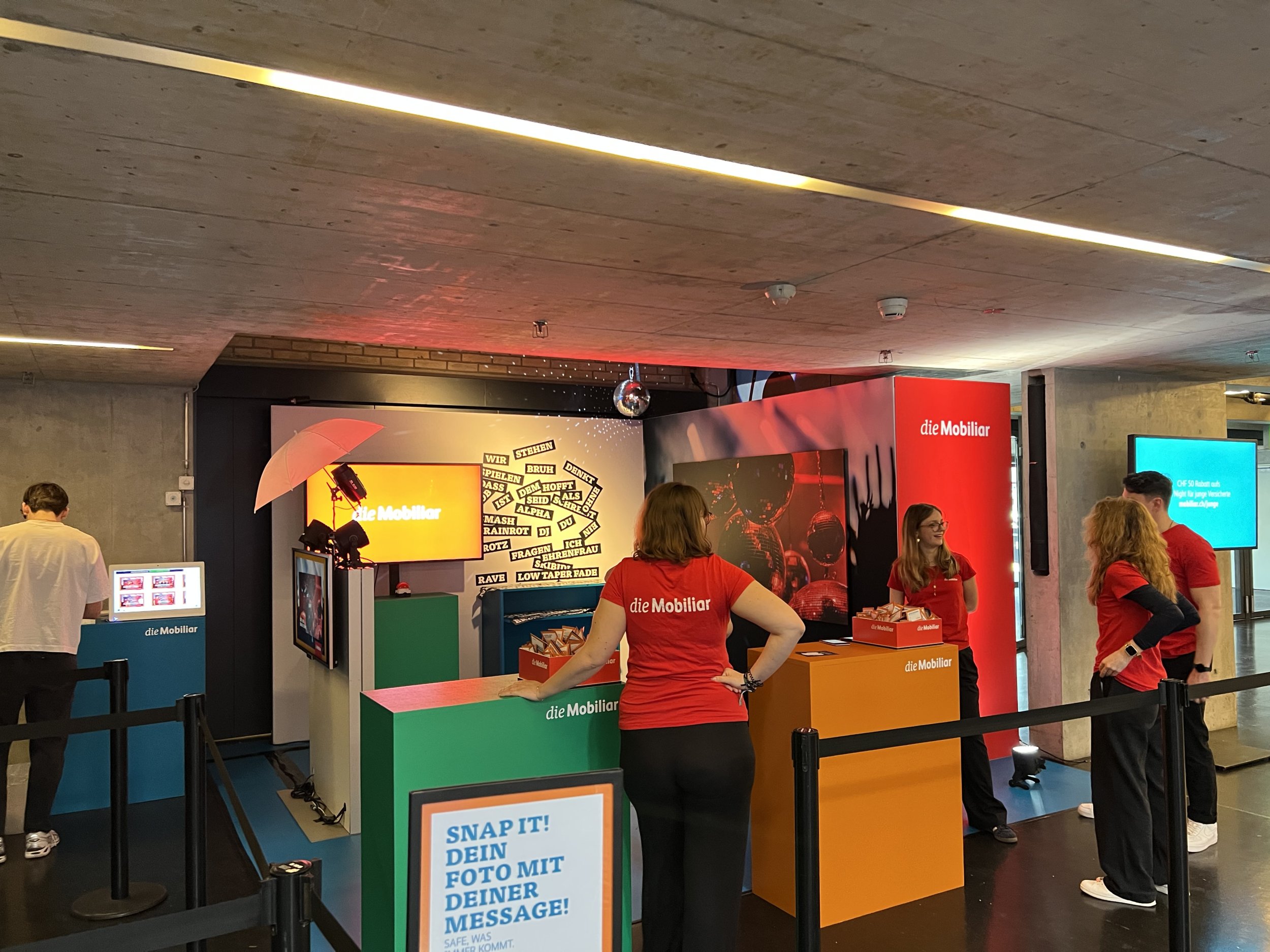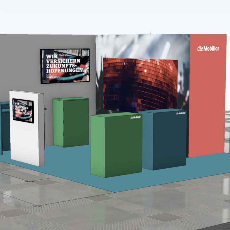 Für das Mobiliar-Projekt konnte unser Krea-, Game-Design- und Bau-Team aus dem Vollen schöpfen. Das Standdesign wurde speziell auf die herausfordernden Gegebenheiten im Hallenstadion Zürich zugeschnitten – akribisch im CAD geplant und mit passgenauen Modulen umgesetzt. Auch das Mobiliar stammt aus unserer hauseigenen Werkstatt: individuell gefertigt, hochwertig verarbeitet und farblich exakt auf die frischen Jugendfarben der Mobiliar abgestimmt.
