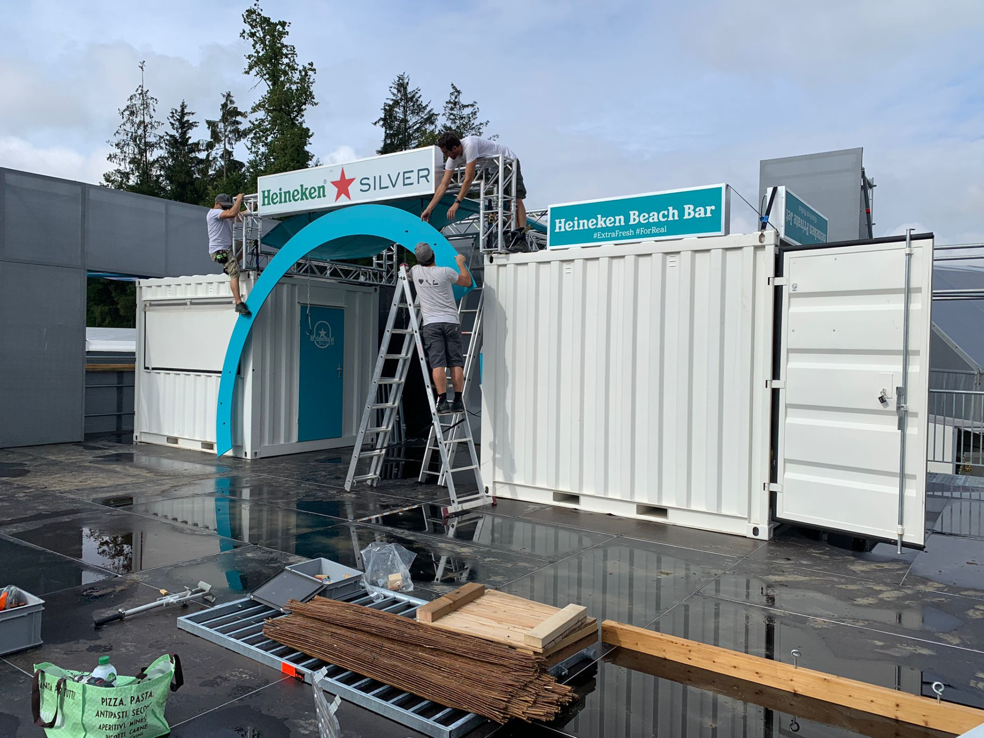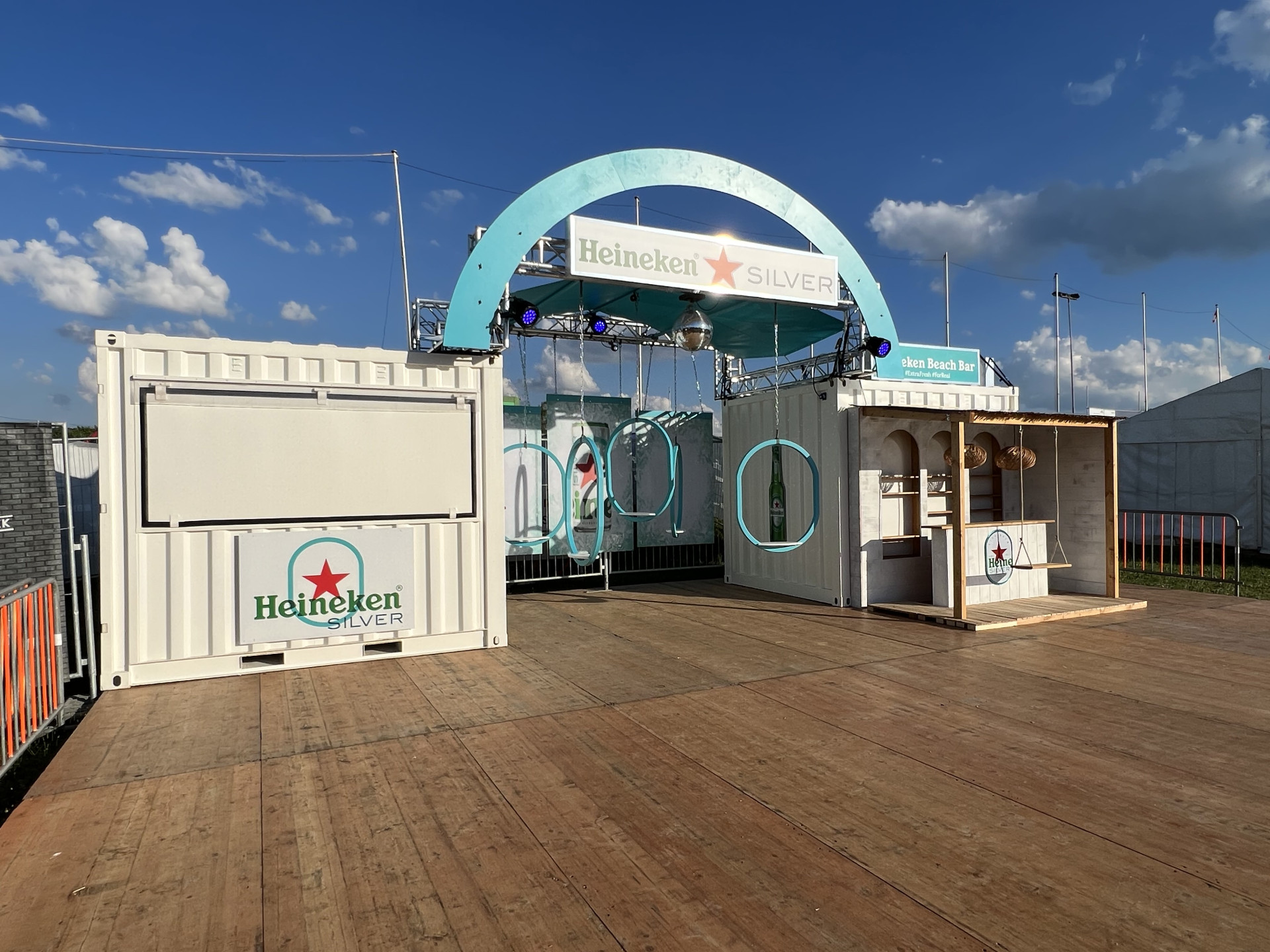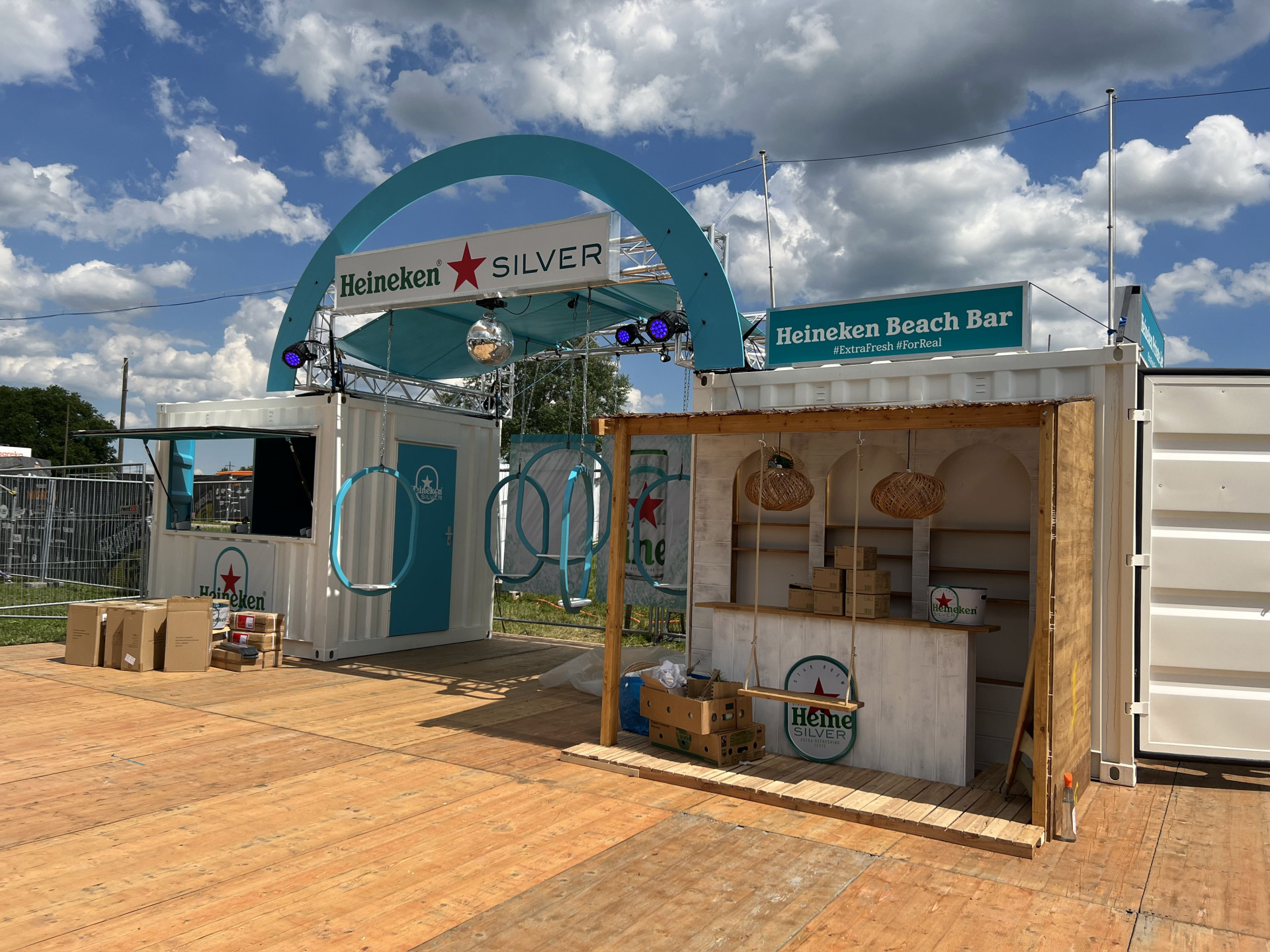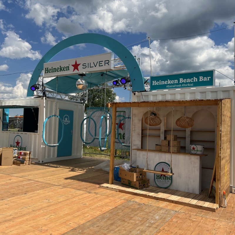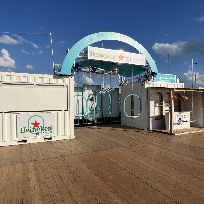 Die verkleideten Container dienten dem Auftritt von Heineken Silver an verschiedenen Festivals im Sommer 2022 als Unterbau. Ziel war es, die Besuchenden auf verschiedenen Ebenen zu überraschen. Als Eyecatcher dienten die Silver-Schaukeln und die karibische Strandbar. Etwas versteckt, die Privat-Jet-Installation als Überraschungselement.