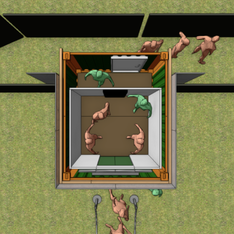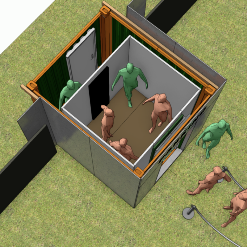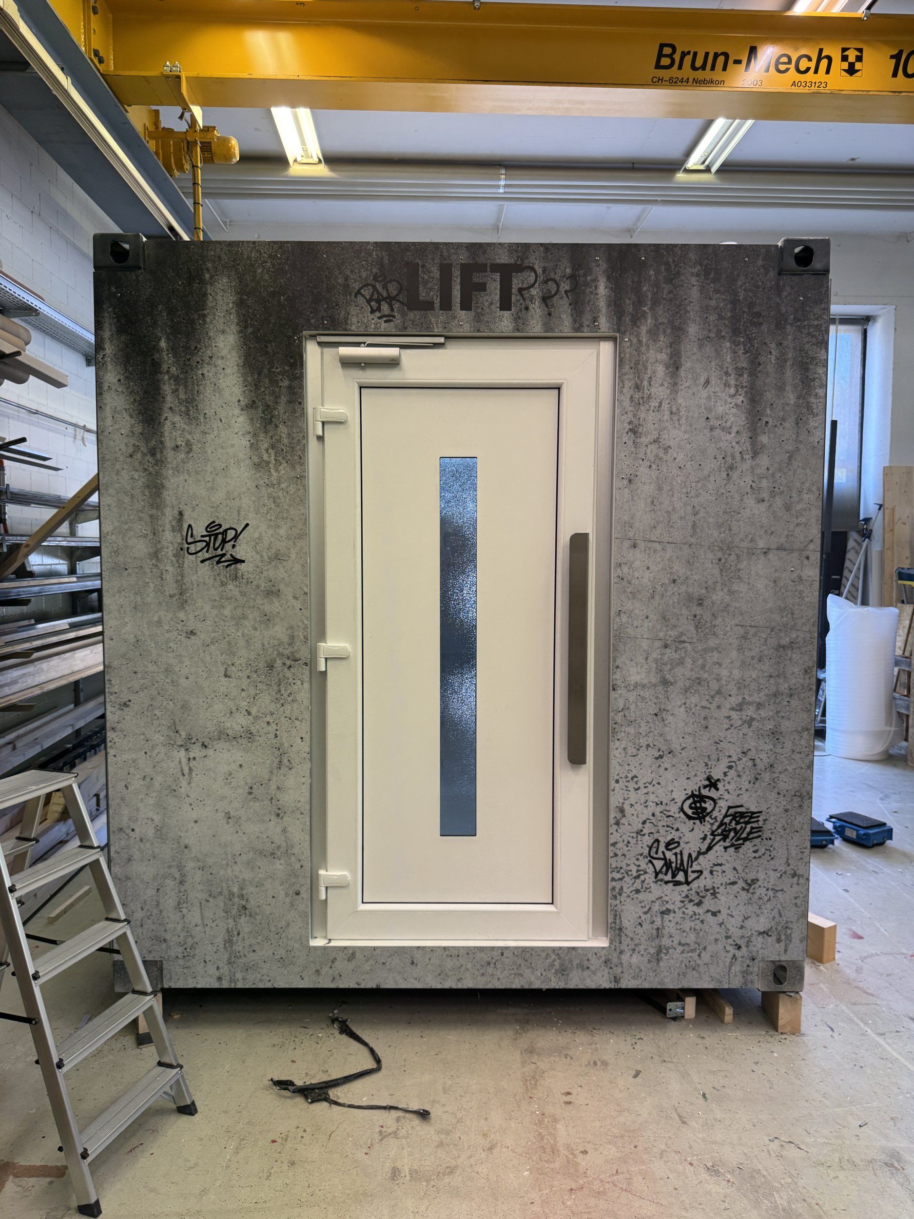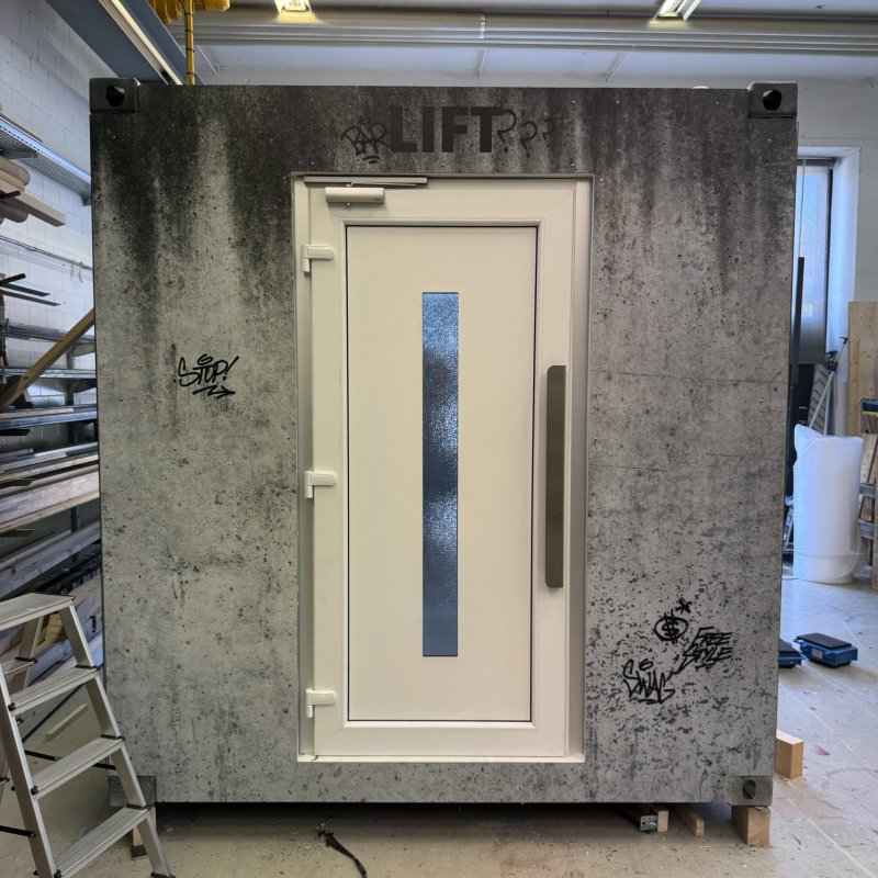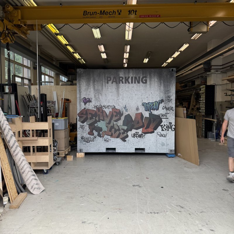 Der Container wurde von unserem Bauteam sorgfältig geprüft und umfassend überarbeitet. Für die authentische Umsetzung der Lift-Idee waren zahlreiche durchdachte und kreative Lösungen erforderlich. Um ein angenehmes Raumklima zu gewährleisten, wurde der Container von uns mit selbstklebender Isolierung ausgestattet. Der massgeschneiderte Aufbau erhielt zudem eine echte Lifttür sowie ein Rolltor, um ein möglichst realistisches Erscheinungsbild zu schaffen. Der Knopfmechanismus, die Audiosteuerung und das Lichtsystem erforderten viel Tüftelei, Präzision und Feingefühl. Um einen reibungslosen Ablauf zu gewährleisten, wurde ein separater Operatorraum integriert, der über eine "hidden door" zugänglich ist.