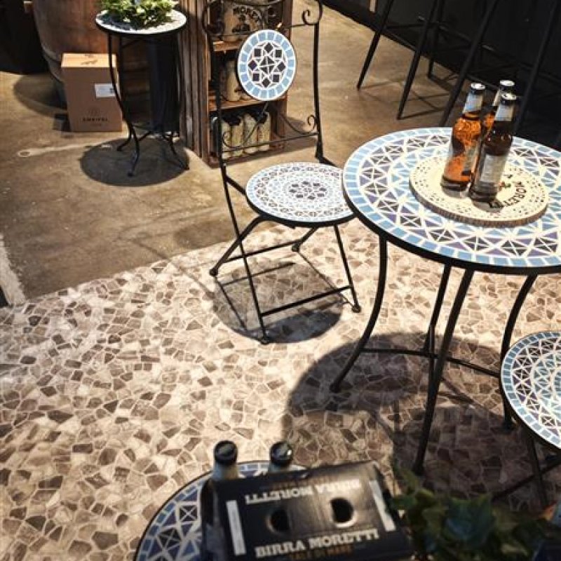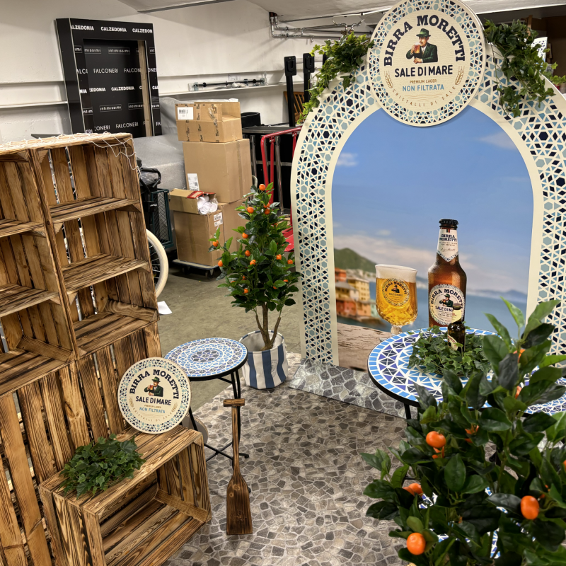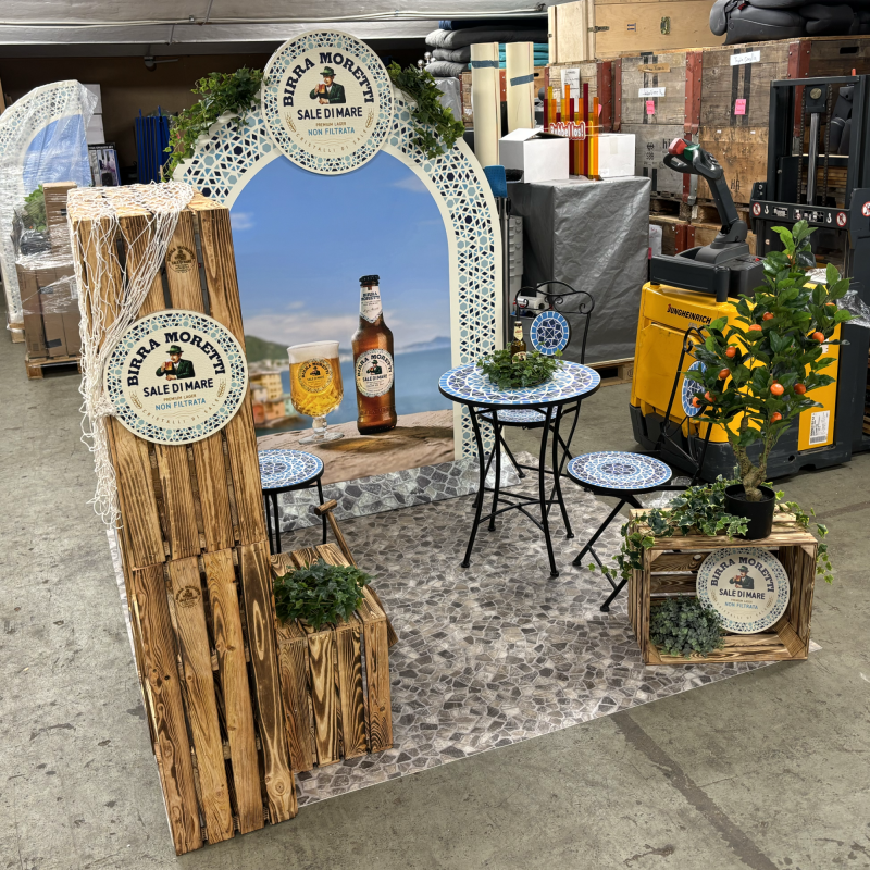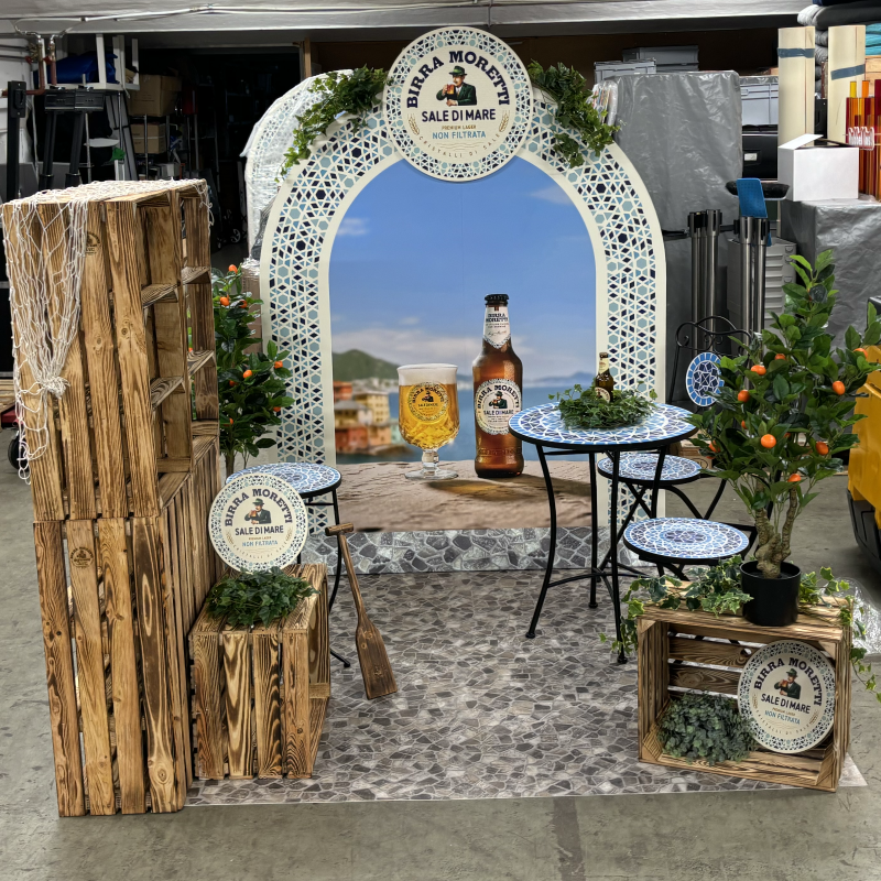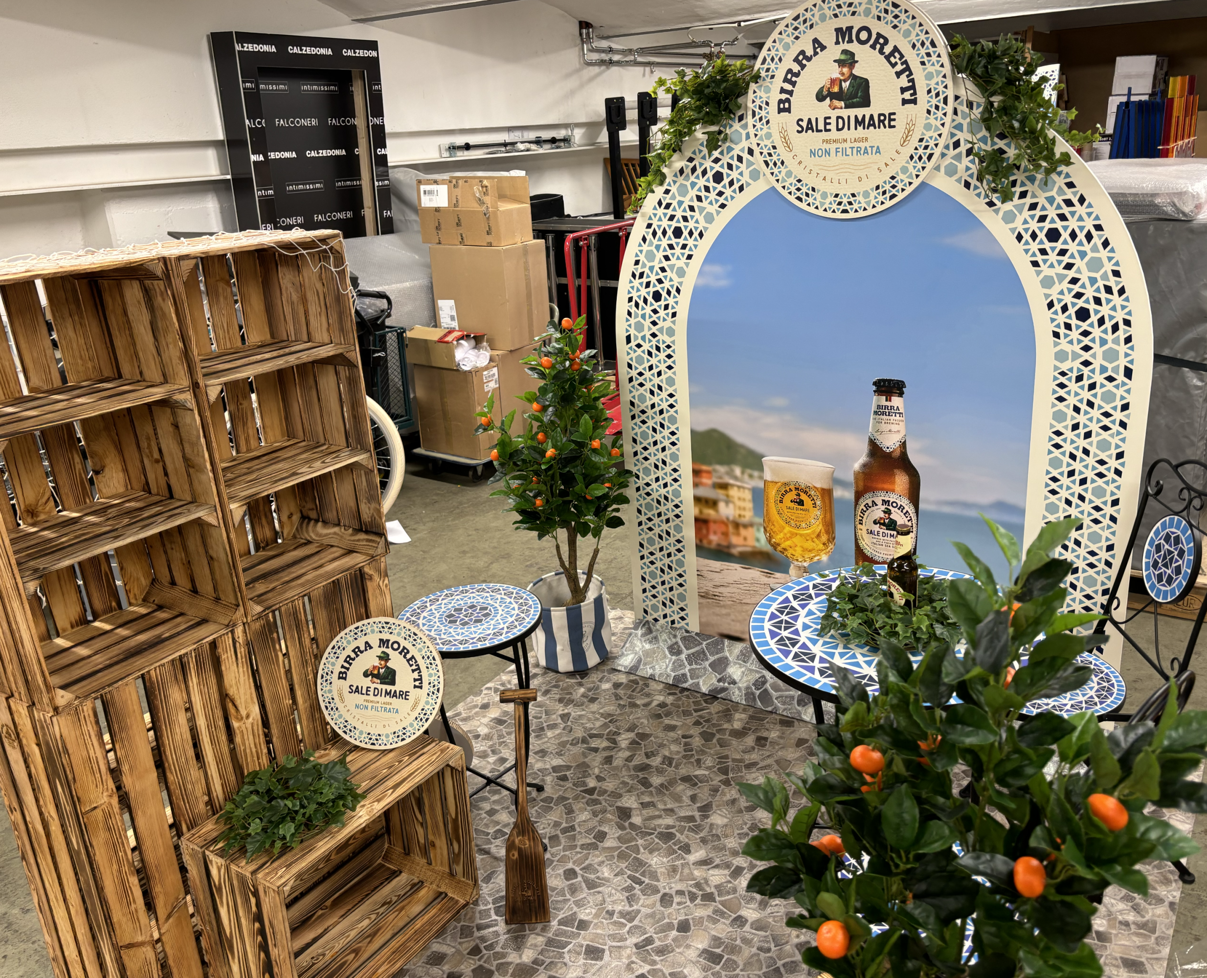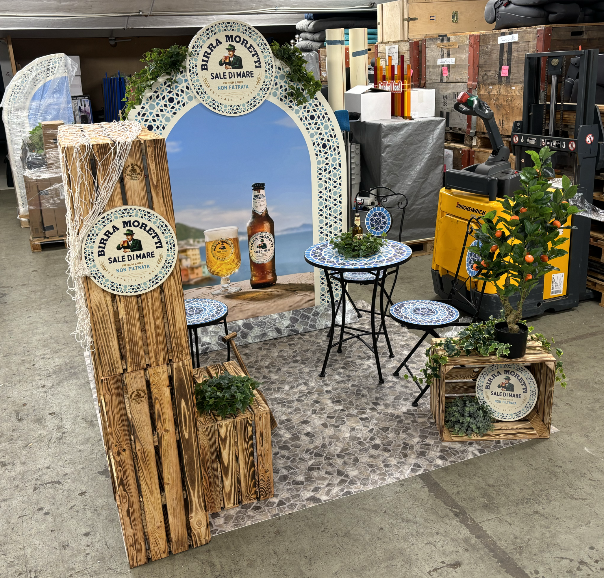 Italienischer Plaza-Look und gemeinsames Anstossen werden bei Birra Moretti grossgeschrieben. Der Torbogen und die Keramiktische unterstreichen den mediterranen Flair, während Orangenbäume und Holzkisten das Gesamtbild harmonisch abrunden.