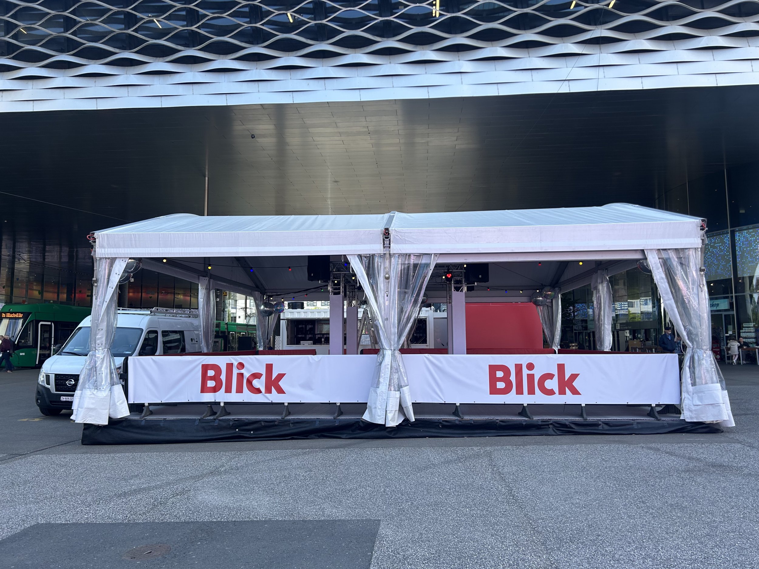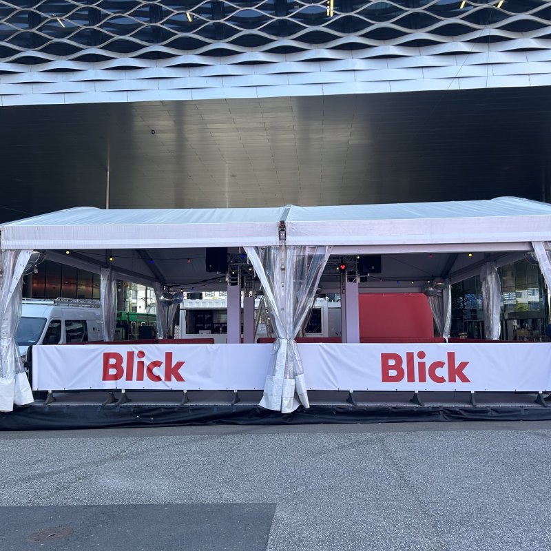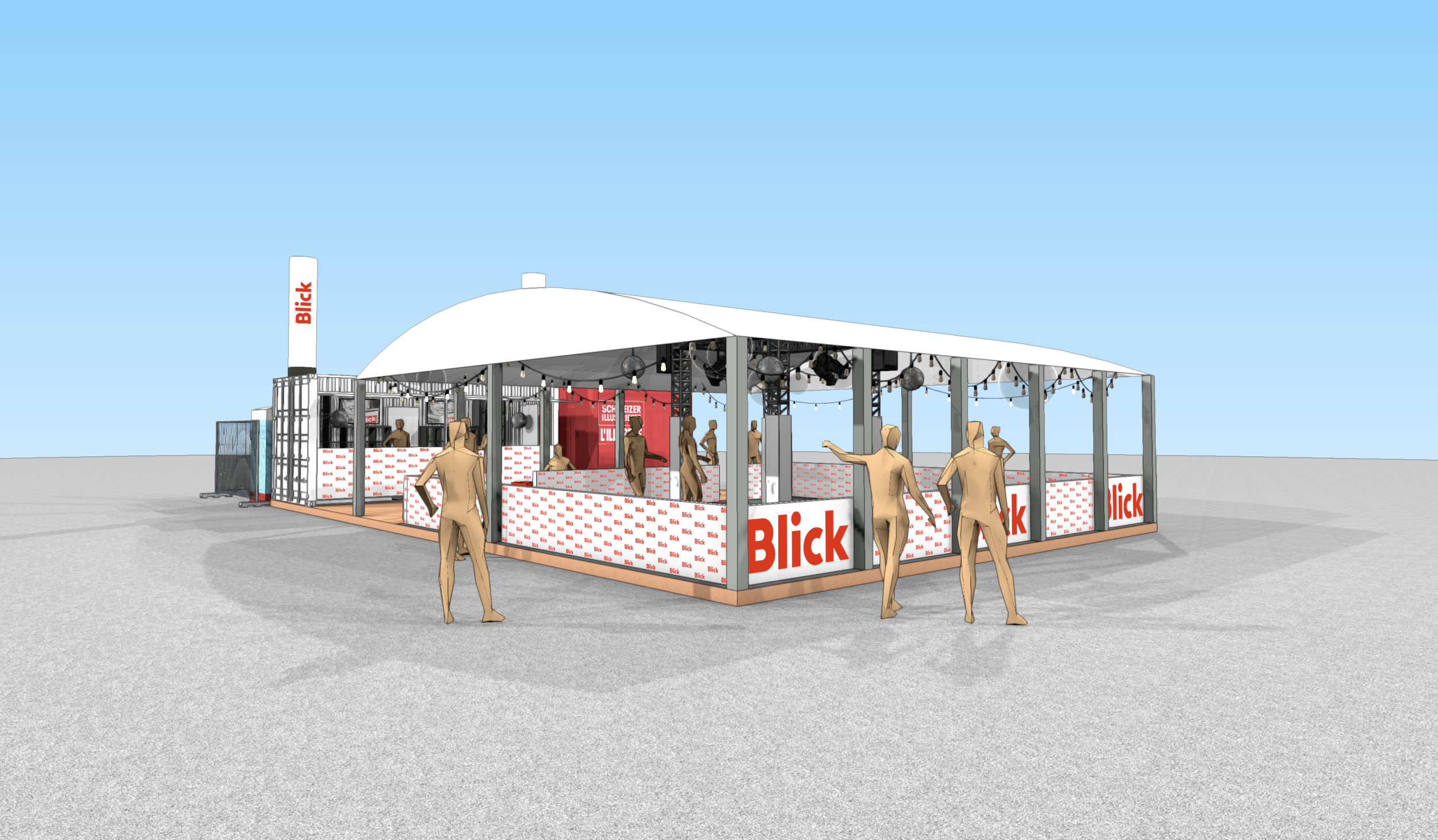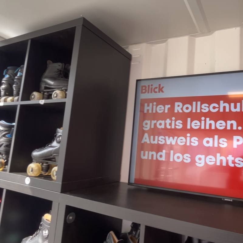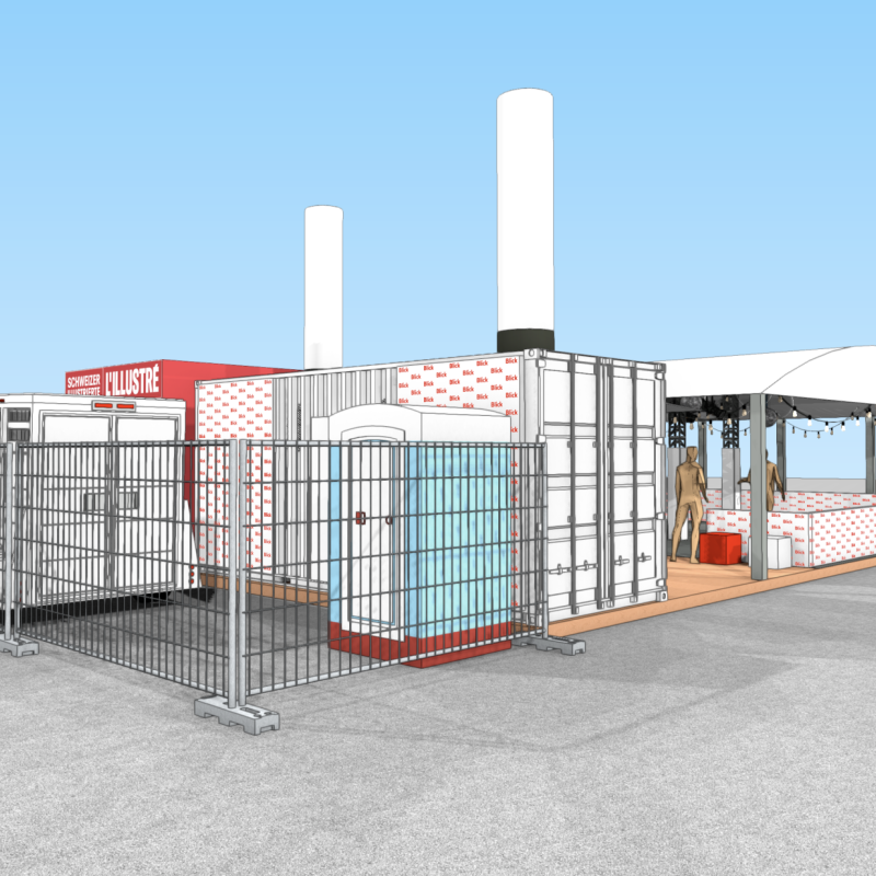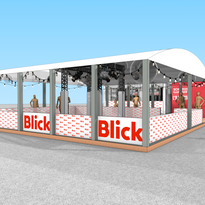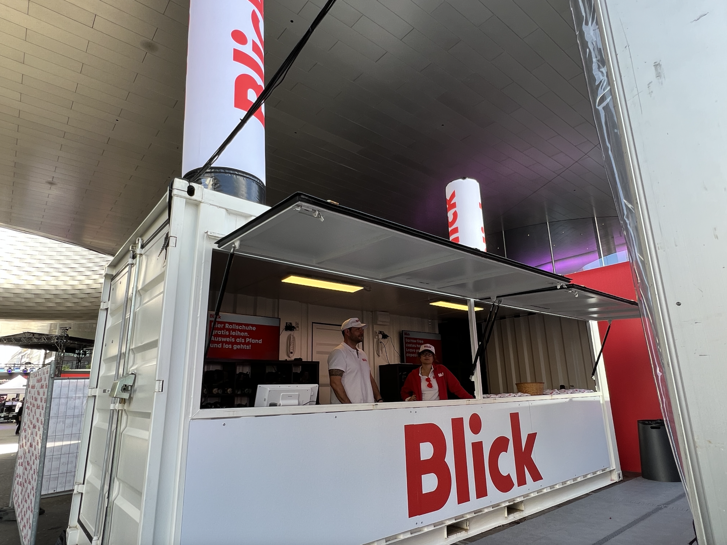 Die meiste Fläche am Stand wurde von der 80m2 grossen Rollschuhdisco eingenommen. Mit Musik und Lichteffekten entstand eine lebendige, spaßige Atmosphäre auf der Tanzfläche, die zu ausgelassener Interaktion einlud. Direkt am Container neben der Theke konnten sich die Besucher Rollschuhe ausleihen. Sowohl der Container als auch das Zelt fügten sich optisch ansprechend in das Gesamtbild des CI/CD von Blick ein.