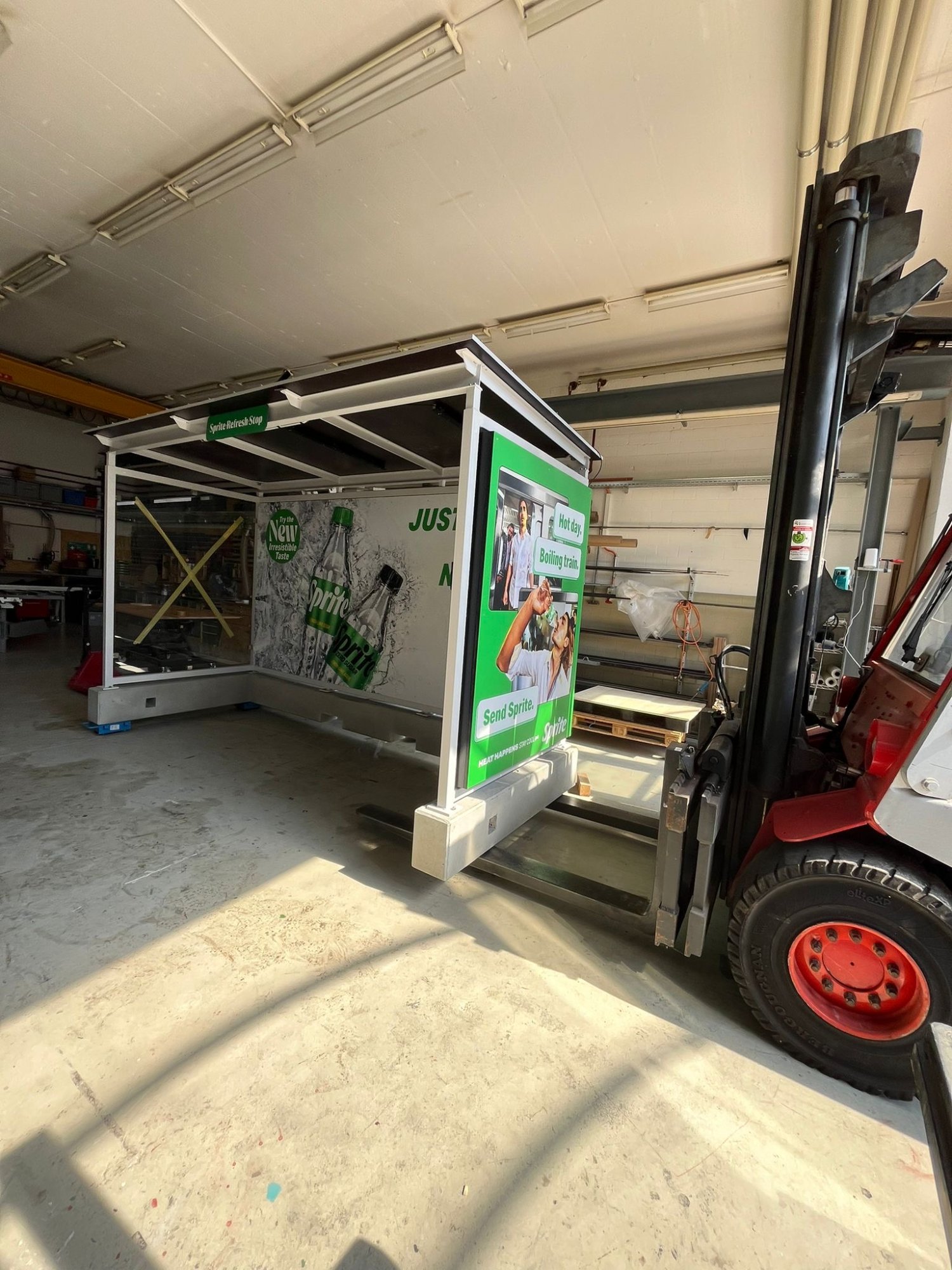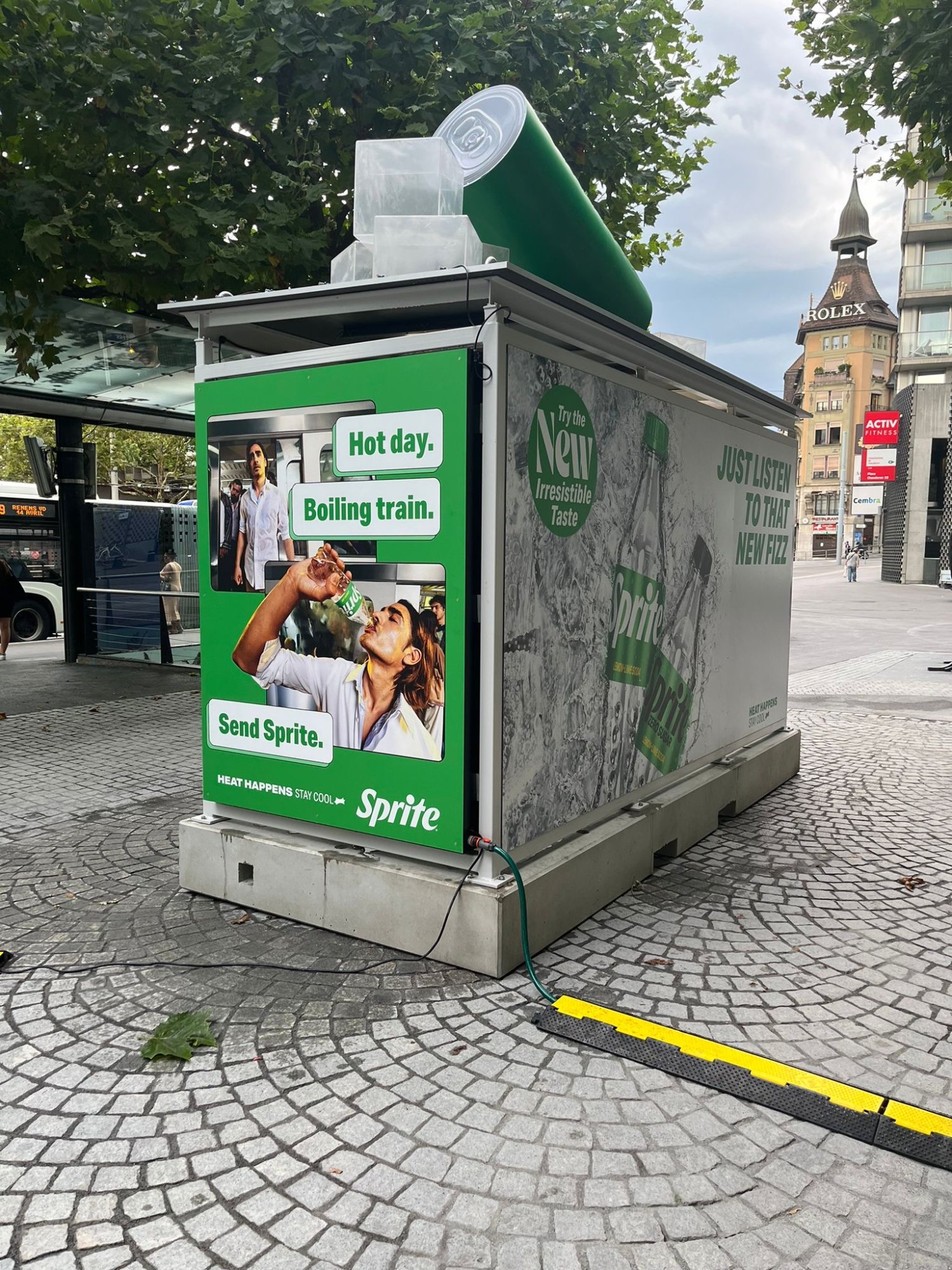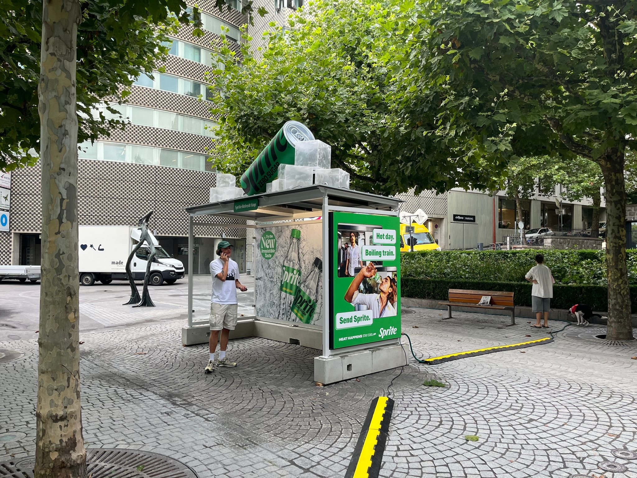 Als Hingucker dienten riesige Eiswürfel sowie eine überdimensionale Sprite-Zero-Dose auf dem Dach. Die Bushaltestelle wurde in verschiedenen Schweizer Innenstädten und an Festivals eingesetzt.