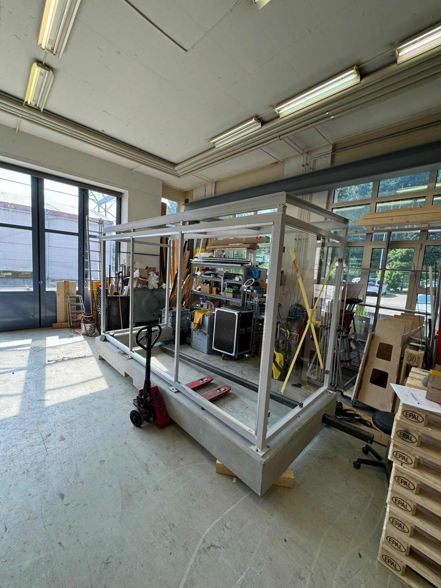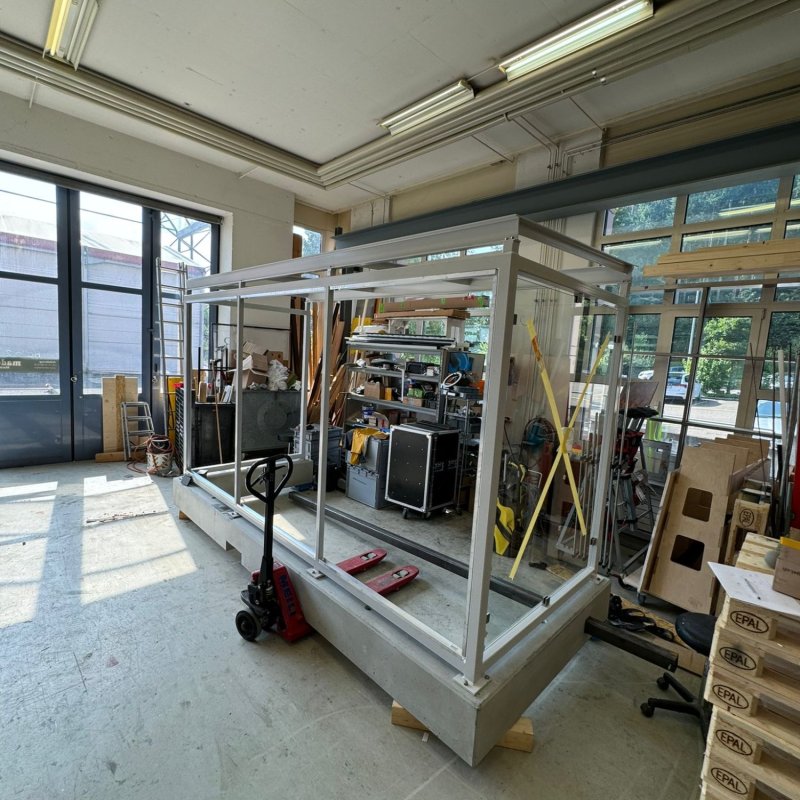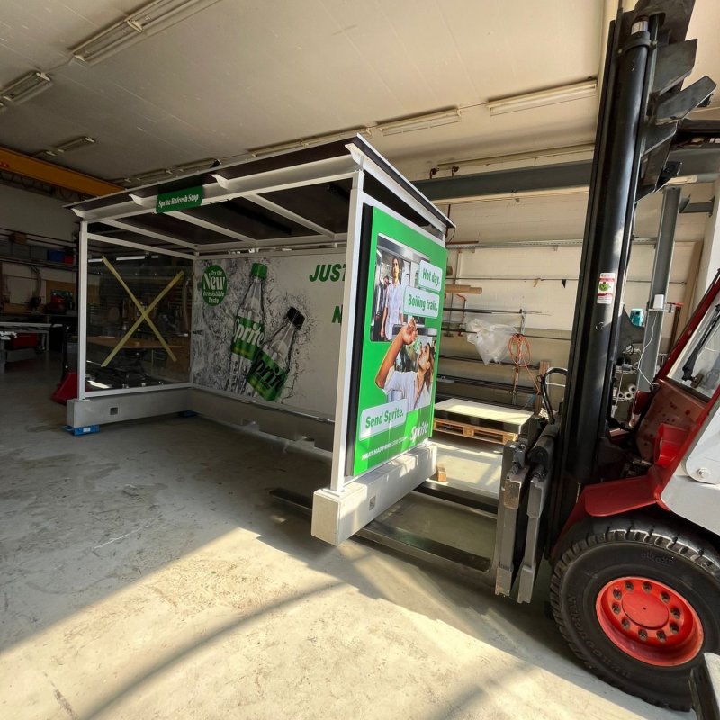 Um das Erlebnis so real wie möglich zu gestalten, wurde ein echtes Betonfundament gegossen. Die restliche Konstruktion der Haltestelle fertigten wir in unserer Werkstatt in Busslingen. Unsere Visualisierungs- und Vermessungsspezialisten konnten dabei ihr volles Potenzial ausschöpfen. Ein besonderes Highlight war das Düsensystem: Auf Knopfdruck, geschickt in das leuchtende Werbeplakat integriert, sorgte es für sanften Sprühregen vom vorderen Teil des Dachs.