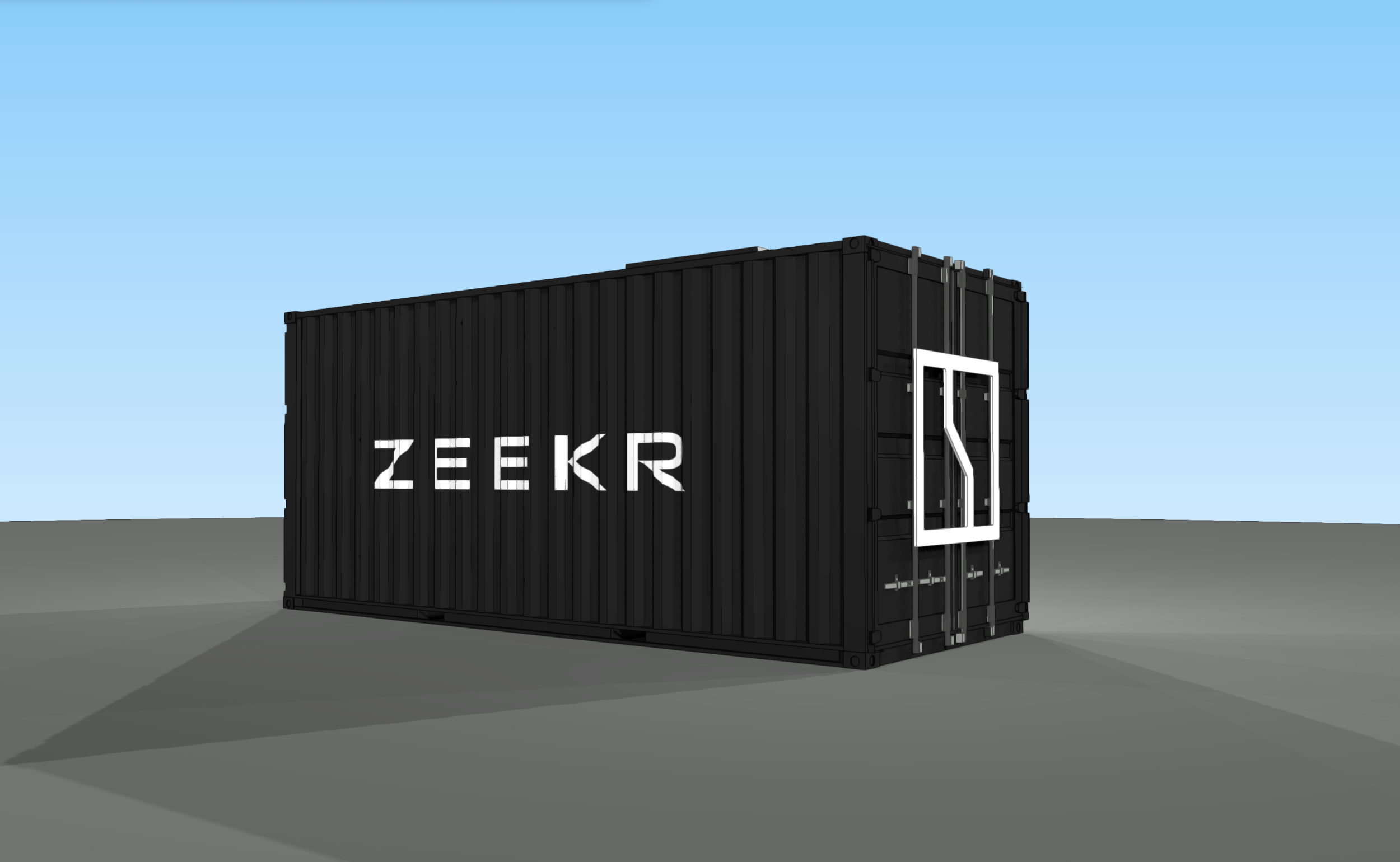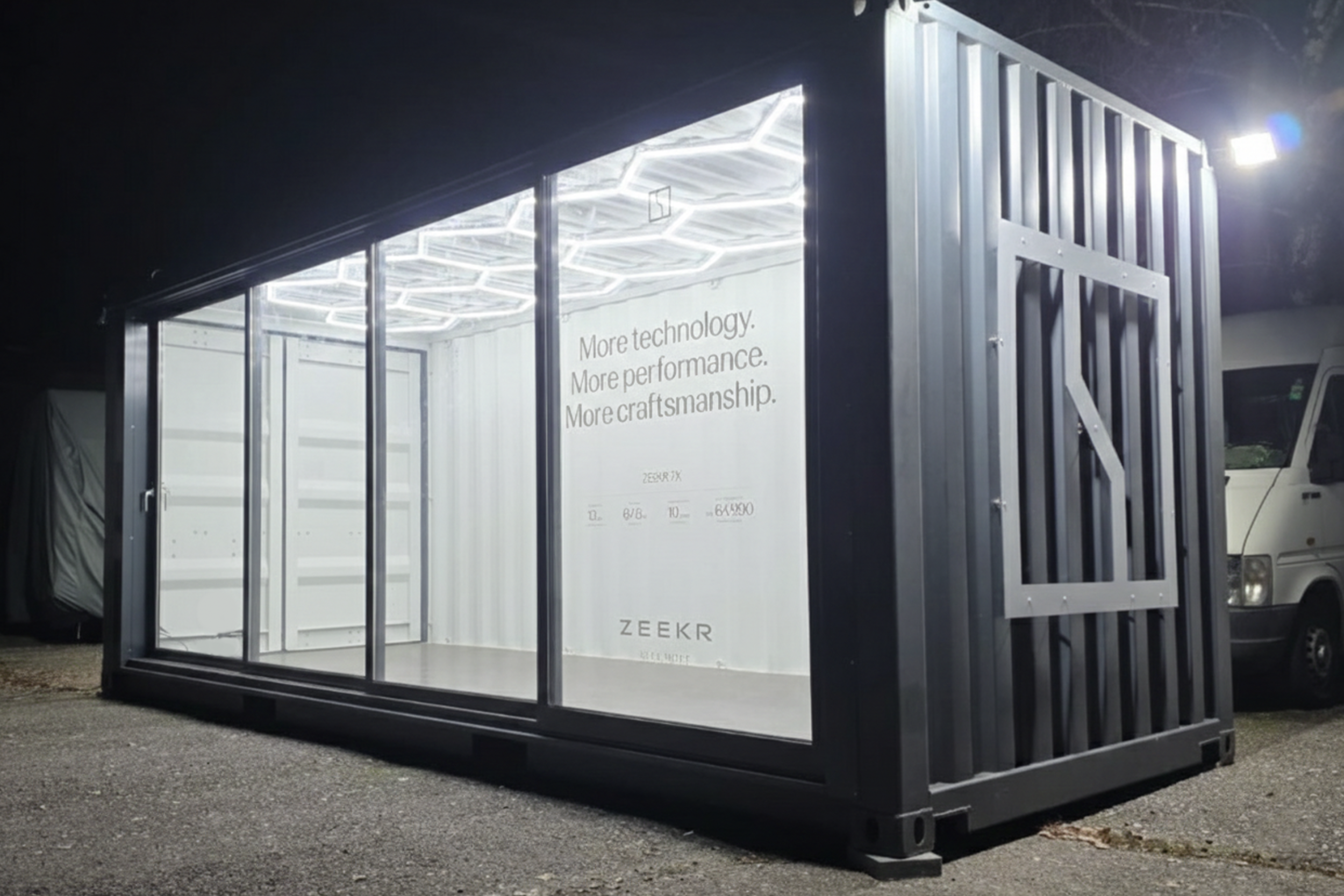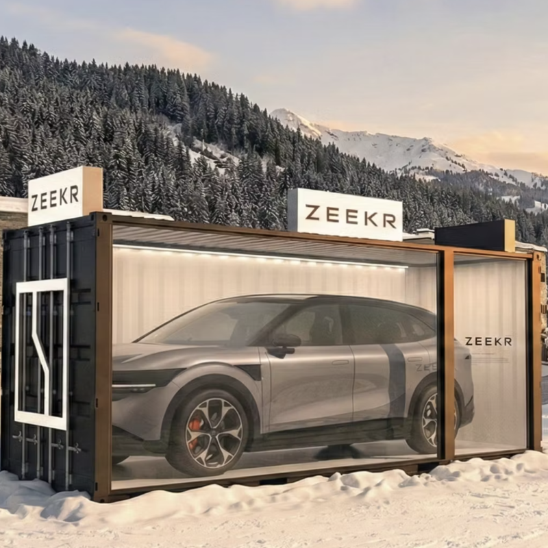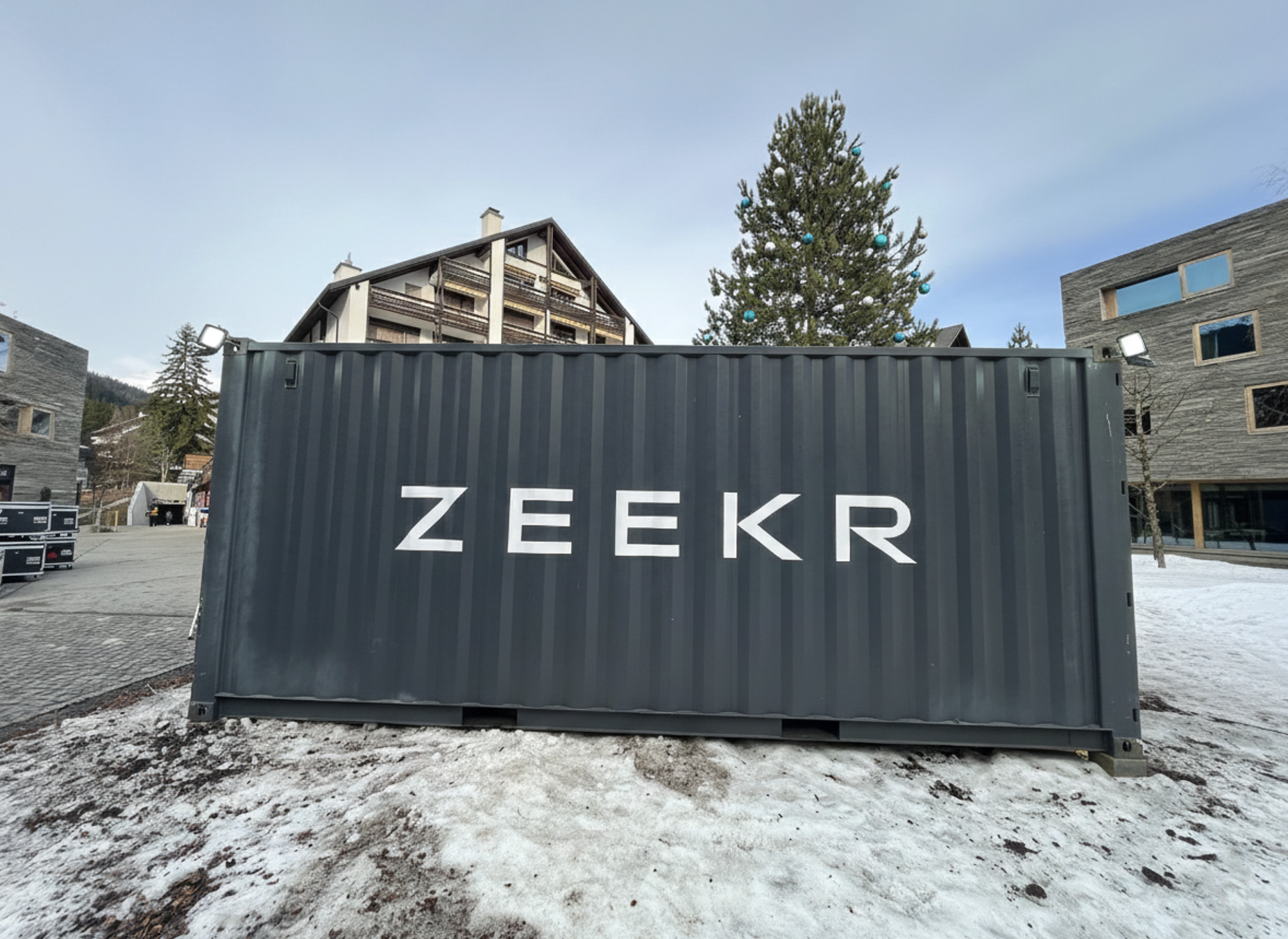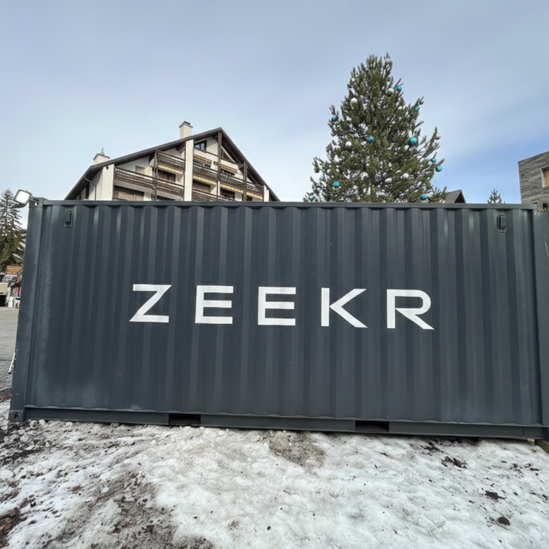 Ein eleganter Container inszeniert als wetterfeste Hülle das Zeekr-Auto-Modell in den Bündner Bergen.