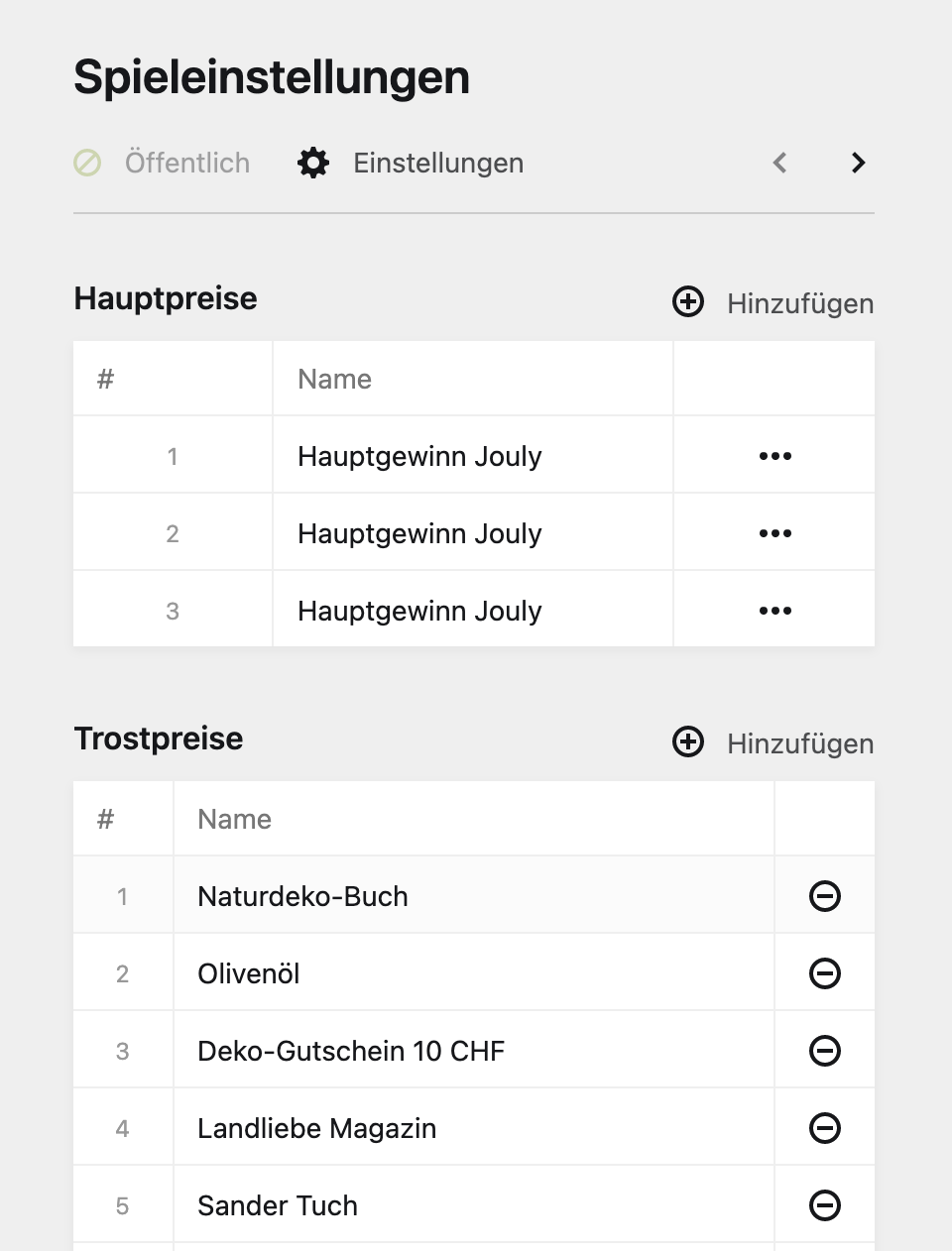 Preis (Linie anklicken), um die Anzahl anzupassen. Die Anzahl definiert die Auftrittswahrscheinlichkeit des Preises. Wird der Wert auf 0 gesetzt, erscheint der Preis nicht mehr auf dem Glücksrad. Nach der Änderung mit OK bestätigen.